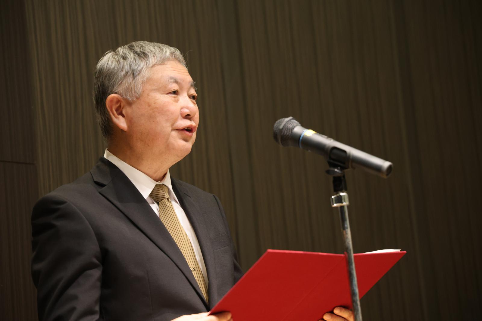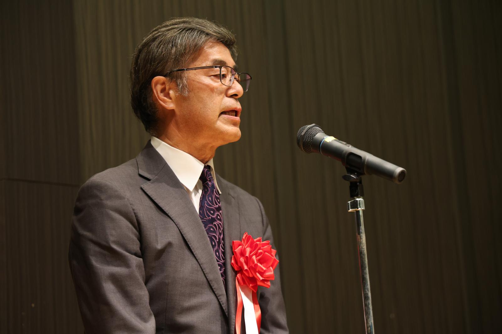 お祝いの言葉を贈る福田学長