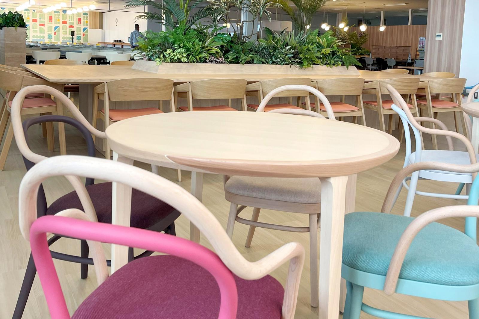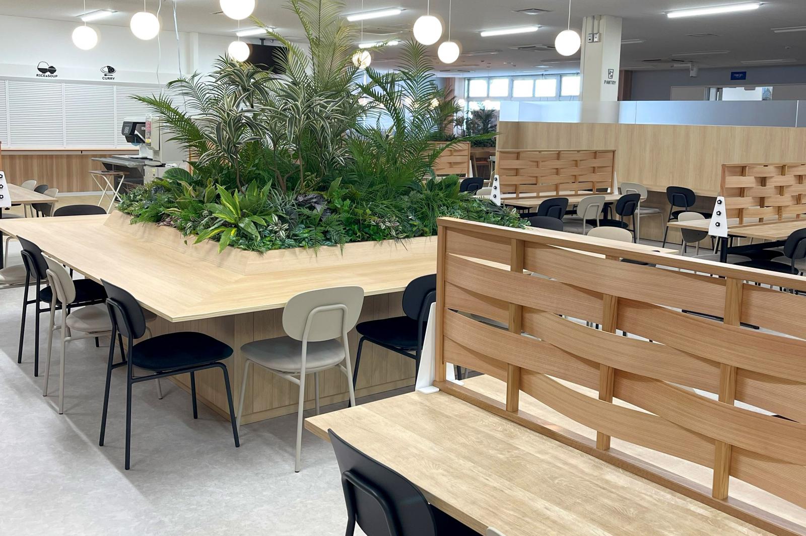 秋田エプソンの社員食堂で「やわらかい木」が活用されました