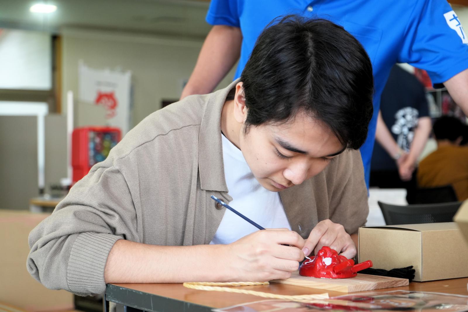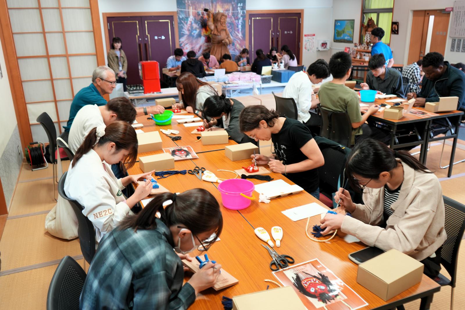 なまはげ太鼓ライブなど各種イベントが開催される交流エリアで、なまはげのお面に色付けをして制作する、なまはげの壁掛け作り体験をしました。参加者は、真剣な表情で色付けに取り組んでいました。完成した作品には、表情や髪型など個性溢れた工夫が見られました。