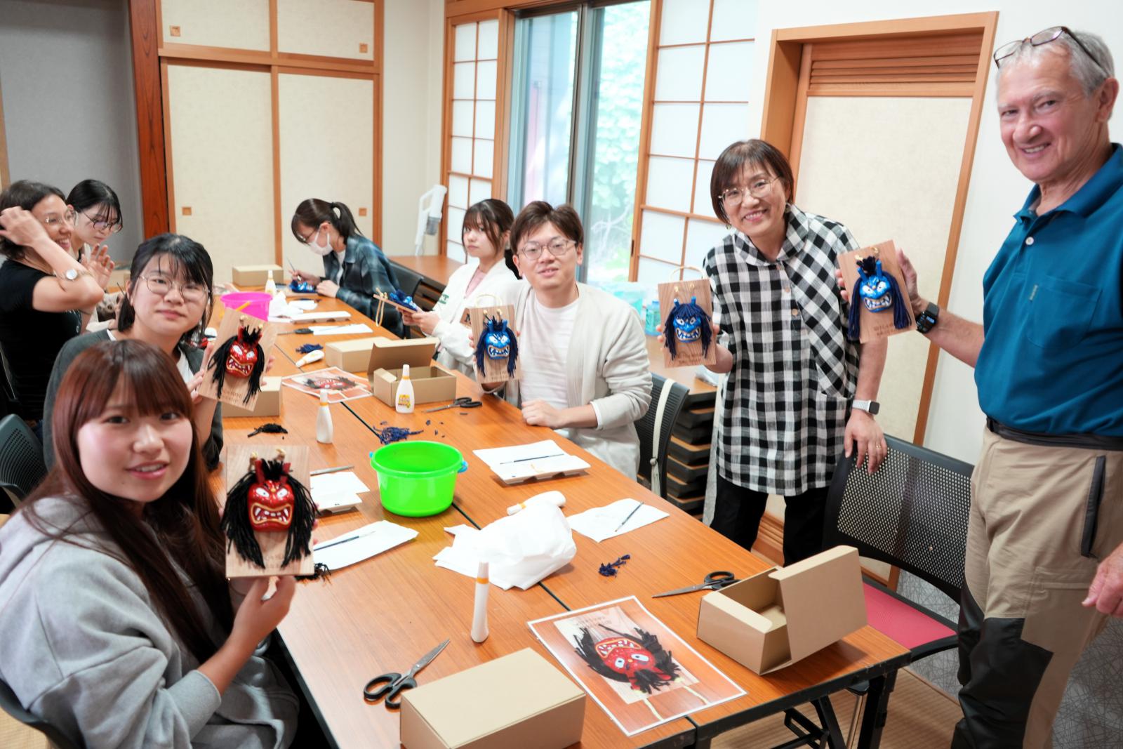 参加した学生は、日本語・中国語・英語など多言語を用いて、自身の出身地や興味・関心について紹介したり、体験の感想について共有したりと、積極的にコミュニケーションを図る様子が見られました。参加した学生からは、「英語でコミュニケーションをとることの喜びと楽しさを実感した。いざ面と向かうと英語が出てこない場面もあったが、その経験も含めて今後の英語学習に繋げていきたいと思った。」「男鹿の文化とナマハゲに触れることができ、地域の歴史や伝統的な祭りを体験しながら学べたのは、大きな財産となった。」といった声が寄せられました。今回の交流を通して、語学への意欲が高まり、秋田の文化への理解を深めるきっかけとなったようです。