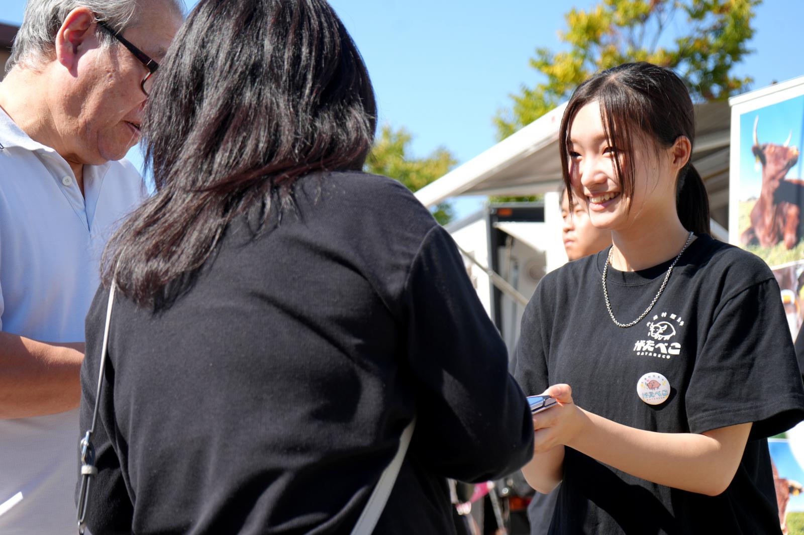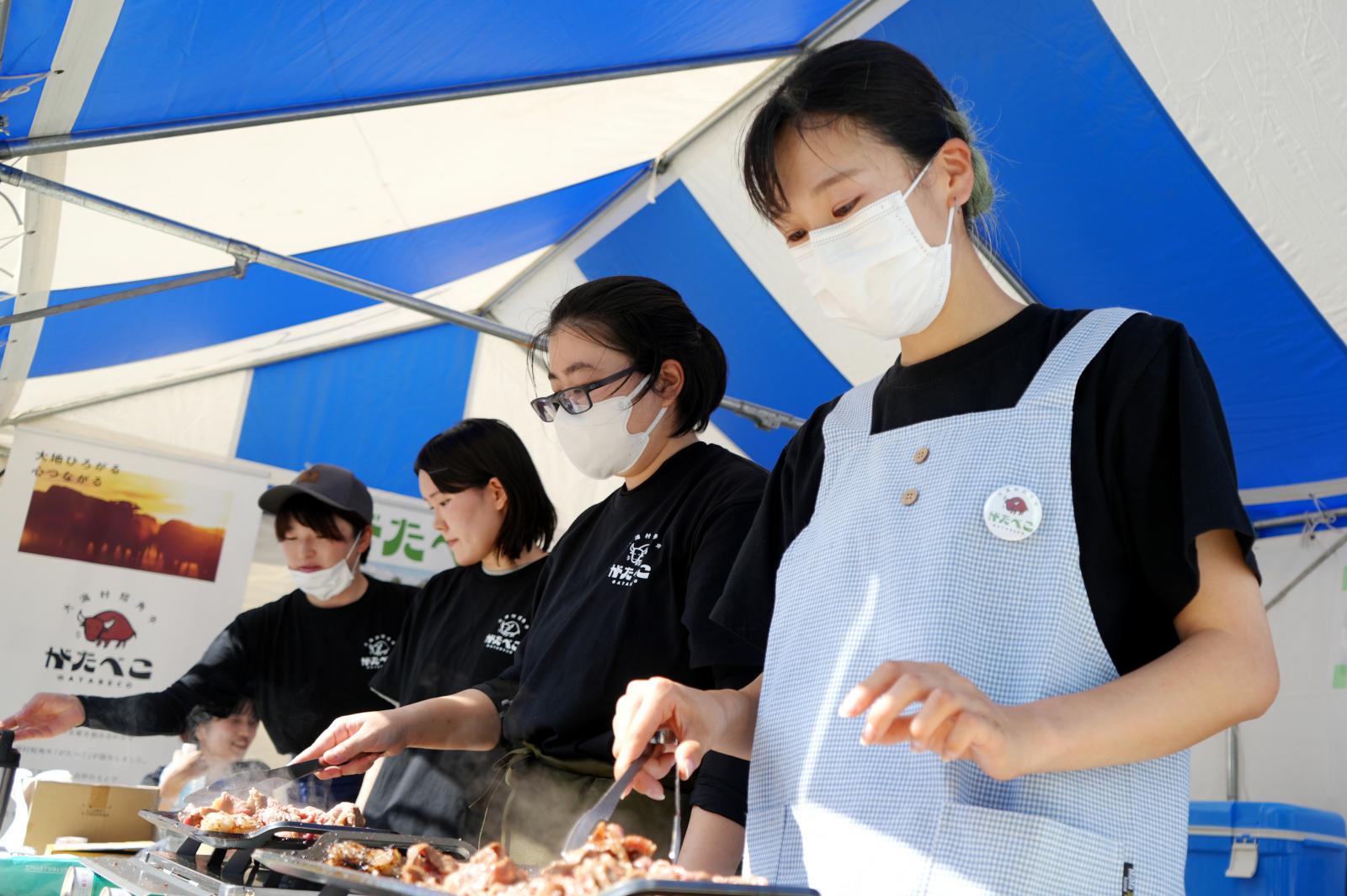「がたべこ® 」 は、アグリビジネス学科/家畜資源利用推進プロジェクトが確立した資源循環型飼養技術と国産飼料100%で育てられています。学生の愛情たっぷりに飼養された「がたべこ® 」の最大の魅力は、低脂肪・高タンパクでヘルシーな赤身肉であることです。放牧による健全な肉質は、嚙めば嚙むほど草の清々しい香りと、凝縮された赤身本来の深い旨みが口いっぱいに広がります。健康志向の方にもオススメできる、まさにな秋田の恵みです!販売ブースの様子♪大盛況です!