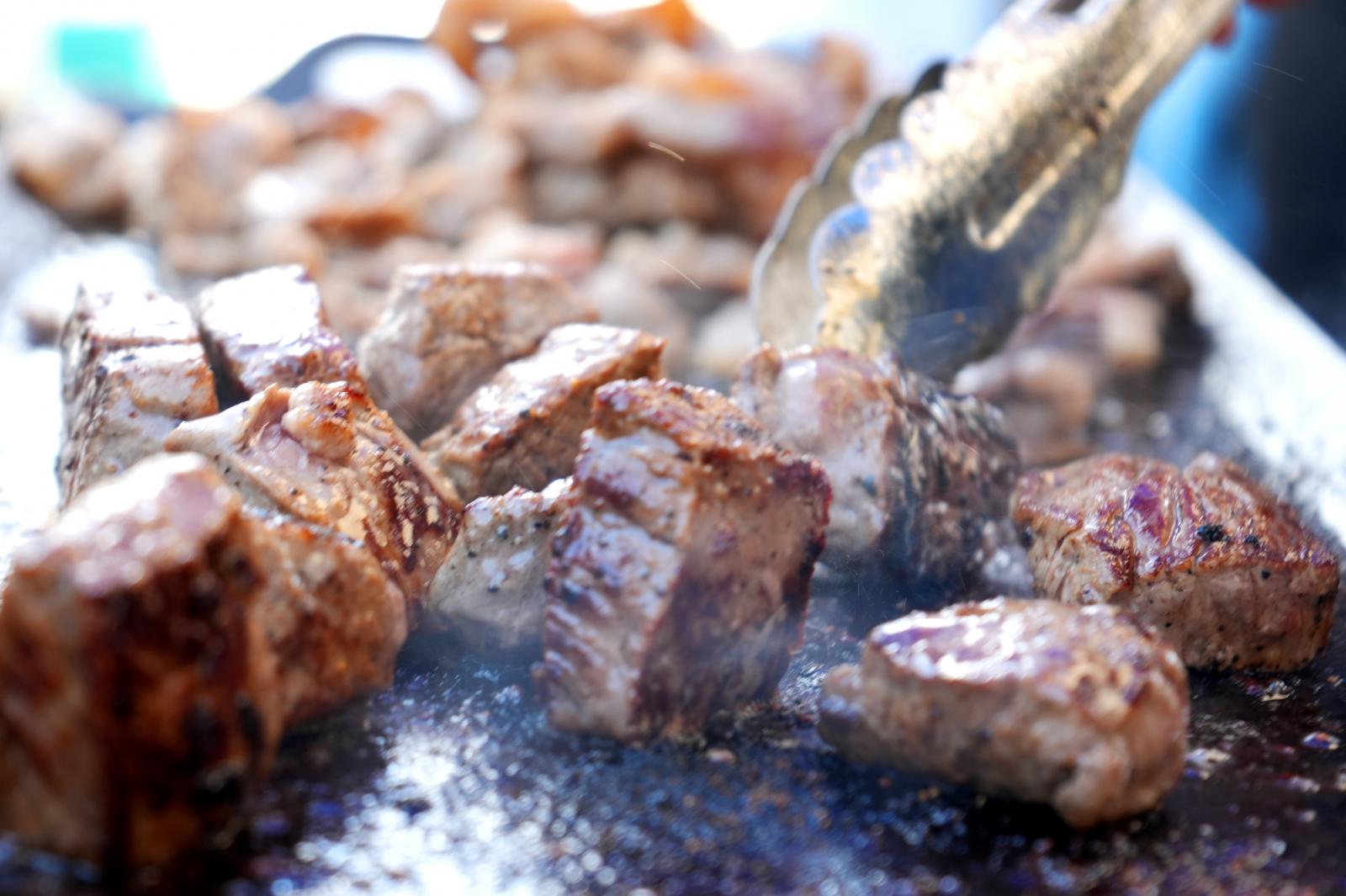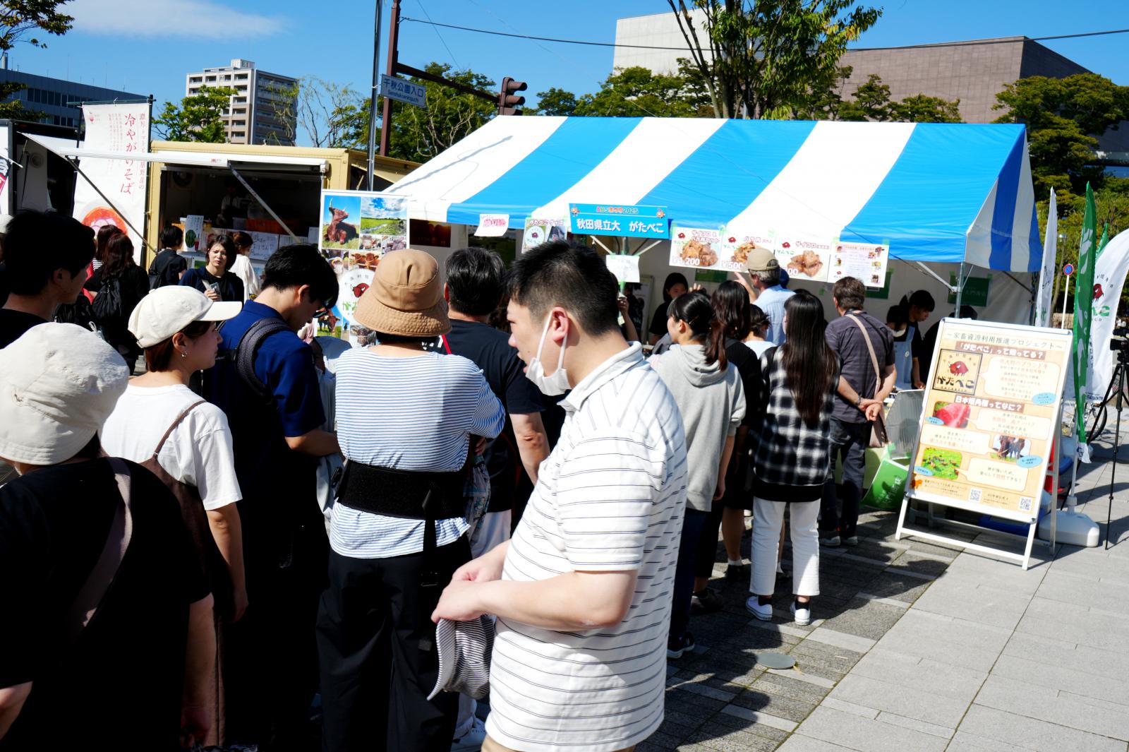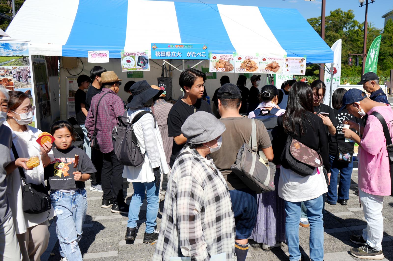 10月4日(土)~5日(日)、秋田市のエリアなかいち特設会場で「ABSまつり2025」が開催され、秋田県立大学短角牛ブランド「がたべこ® 」を初出展しました。当日は、学生が愛情を込めて育てた「がたべこ® 」のサイコロステーキとばら肉の焼肉販売を行いました。両日とも開場と同時に長蛇の列ができ、途切れることなく大変な賑わいとなりました。多くの方々に、低脂肪・高たんぱく・ヘルシーで栄養価が高い「がたべこ® 」の美味しさを存分に味わっていただくことができました。