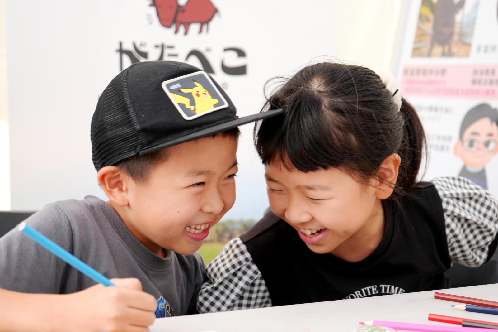お肉を頬張る元気いっぱいの子供たちの笑顔