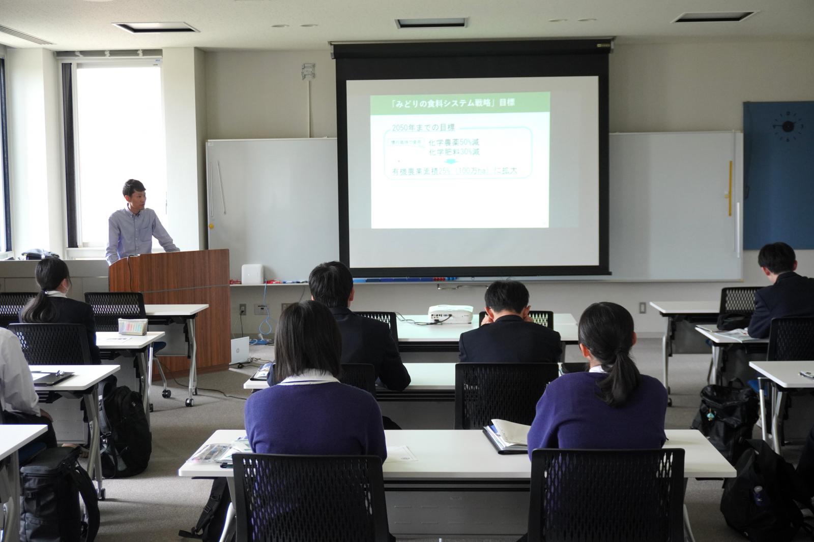 生物資源科学部の概要説明を受けた後、生物環境科学科の田中 草太 助教[専門:土壌動物学]による模擬講義『ミミズの知られざる機能 持続可能な農業を考える』を受講しました。農業を通じて土壌劣化や地球温暖化といった環境問題が生じており、化学肥料・農薬を使用しない環境負荷を低減した栽培方法の一つとして、ミミズや緑肥といった生物の機能について学びました。高校生の皆さんは、実際にミミズを観察しながらミミズの生態系における機能を学んだり、過去に行った学生自主研究『ミミズ探検隊』が行った調査の話に興味深く耳を傾けており、自然への関心を深めていました。