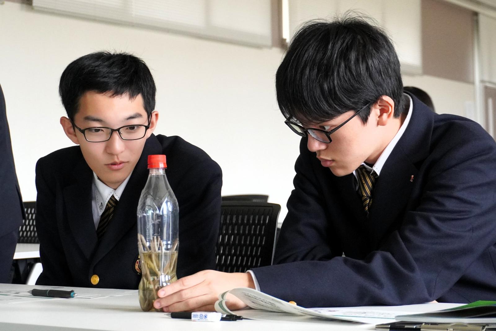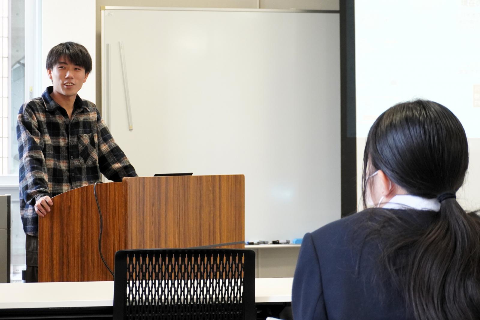 在学生による研究紹介では、生物環境科学科4年の小西 龍斗さん(横手城南高校卒)から、秋田県立大学に進学した理由や研究テーマについて説明がありました。小西さんからは、「高校生のときは興味のなかったものも、学びを重ねるにつれて自分の研究したい分野が見えてきて、今に繋がっている。どんなことにも関心を持ち続けることが大切だと思います。」とメッセージが送られました。説明後には、小西さんが所属している大気・水圏環境学研究室の研究室を見学し、輝く先輩の姿を見て、学びへの意欲が高まったようでした。