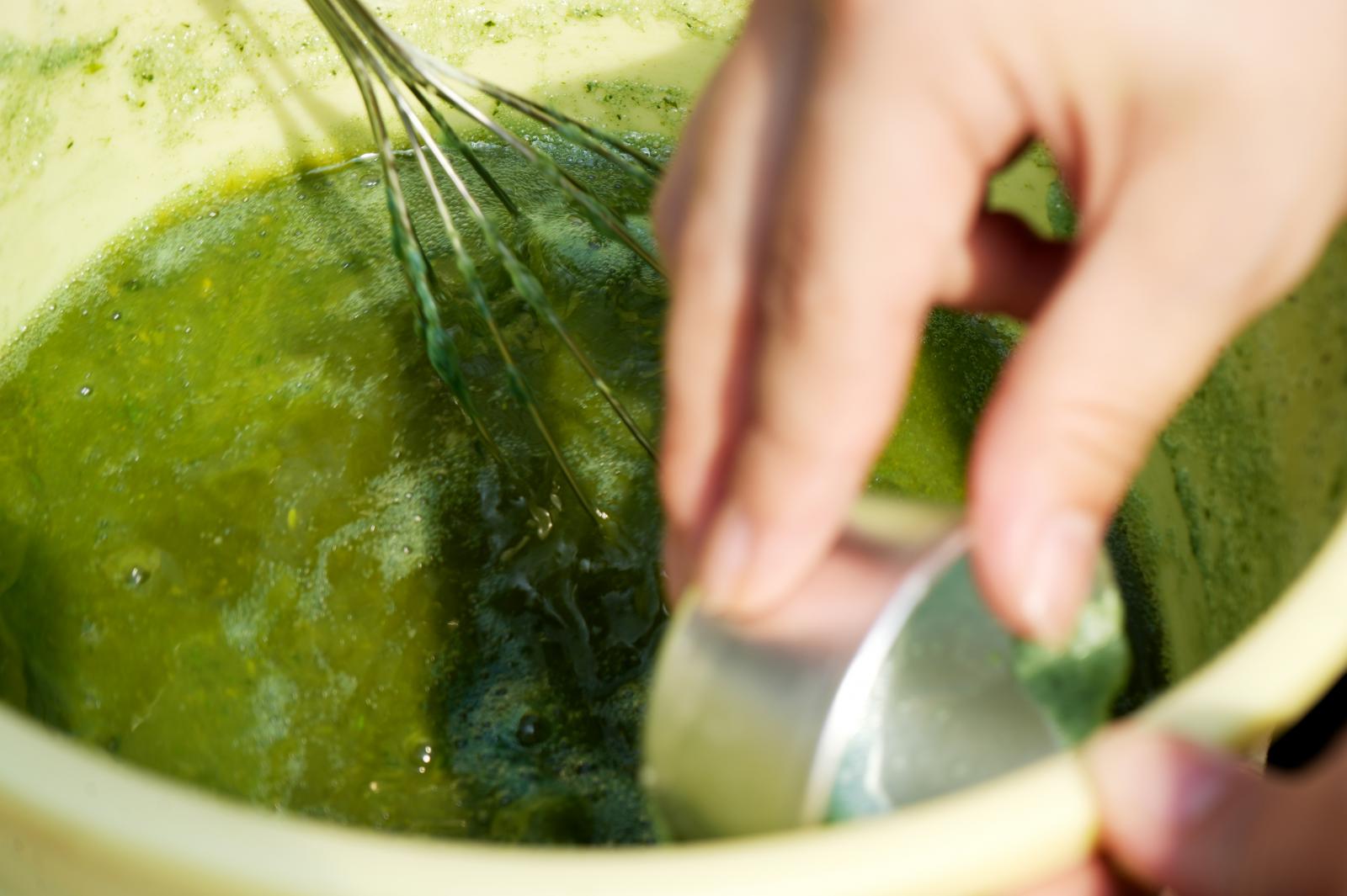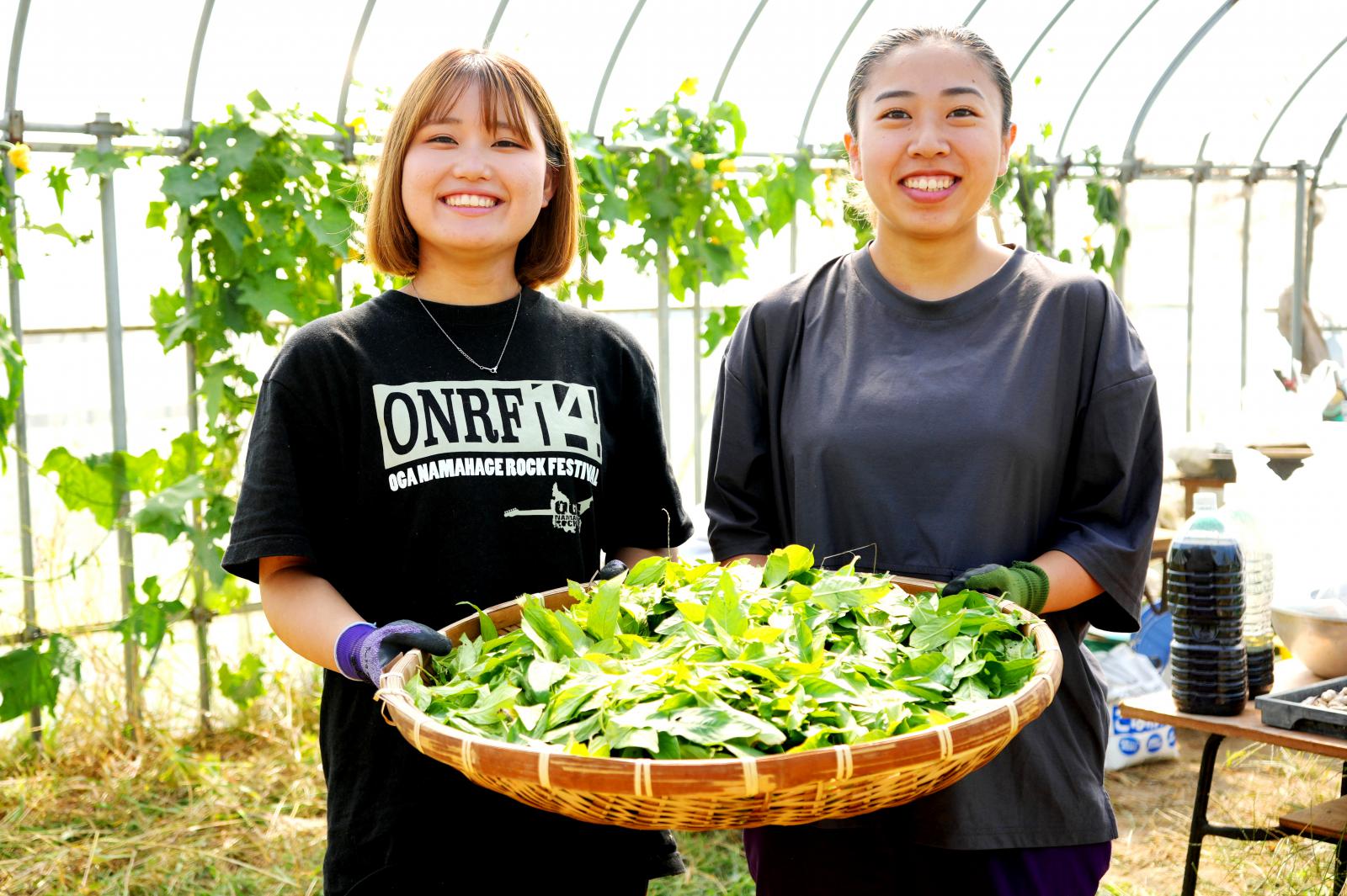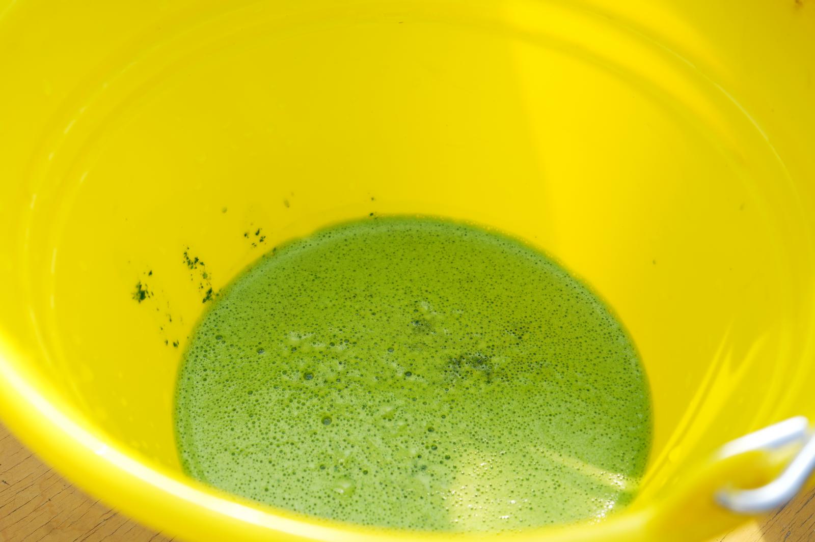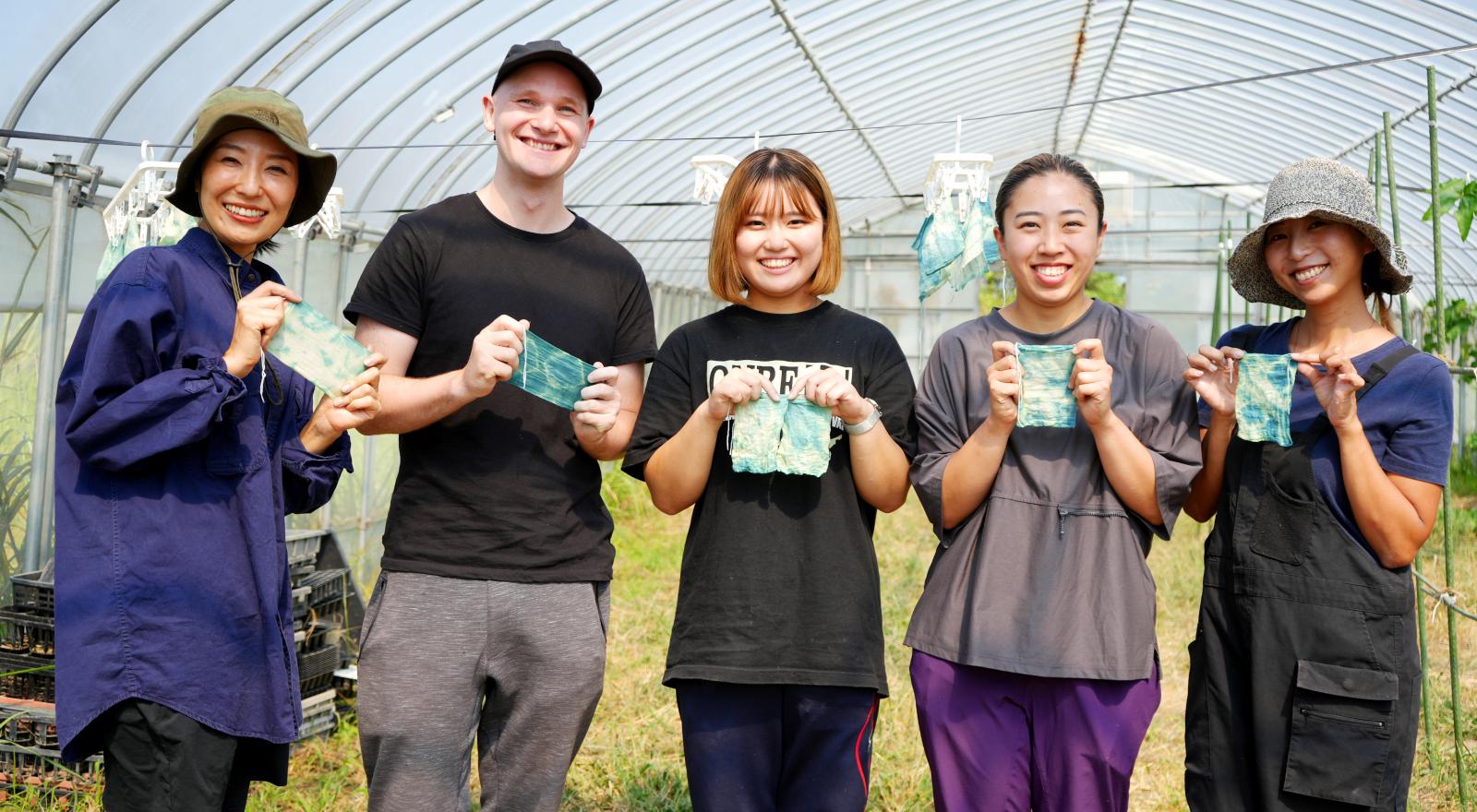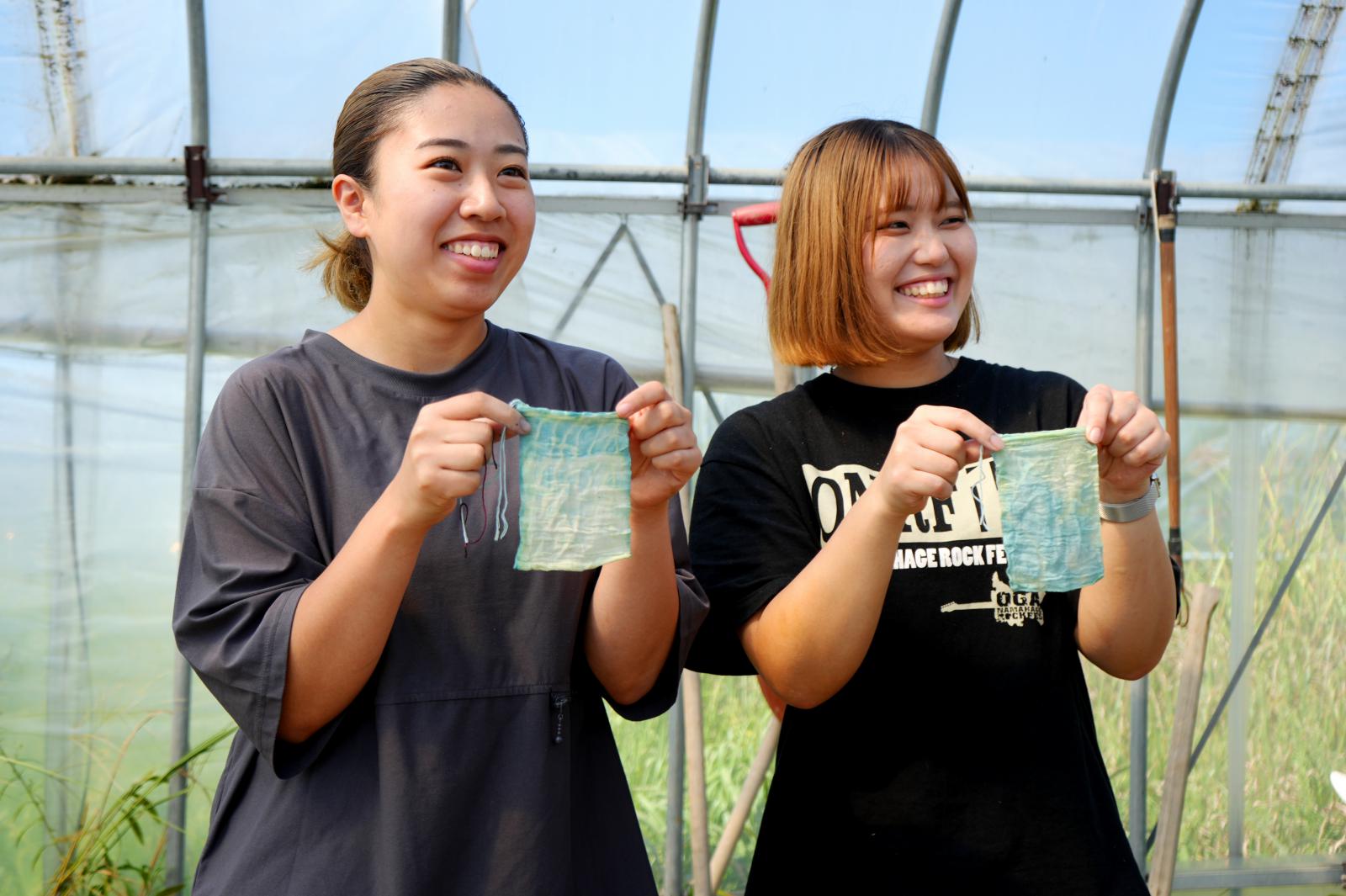 藍染めでは、葉を乾燥させたり発酵させたりして作った染料を使う方法が一般的ですが、今回、学生たちが挑戦したのは、とりたての葉を使う「生葉染め」と呼ばれるもので、短い時間で作業を行い淡い色合いに染まるのが特徴です。まずは、鎌を使って手際よく「藍」を収穫し、収穫後は、一枚一枚、丁寧に葉をもぎ取りました。葉っぱを選別した後、ミキサーで液状にし、これを消石灰と熱湯、ブドウ糖、ビタミンCなどと一緒に混ぜて発酵させることで染料を完成させました。できた染料に綿麻を浸して、染色にも挑戦しました。綿麻に「藍」の鮮やかな色合いが浮かぶと2人は大きな歓声をあげました。