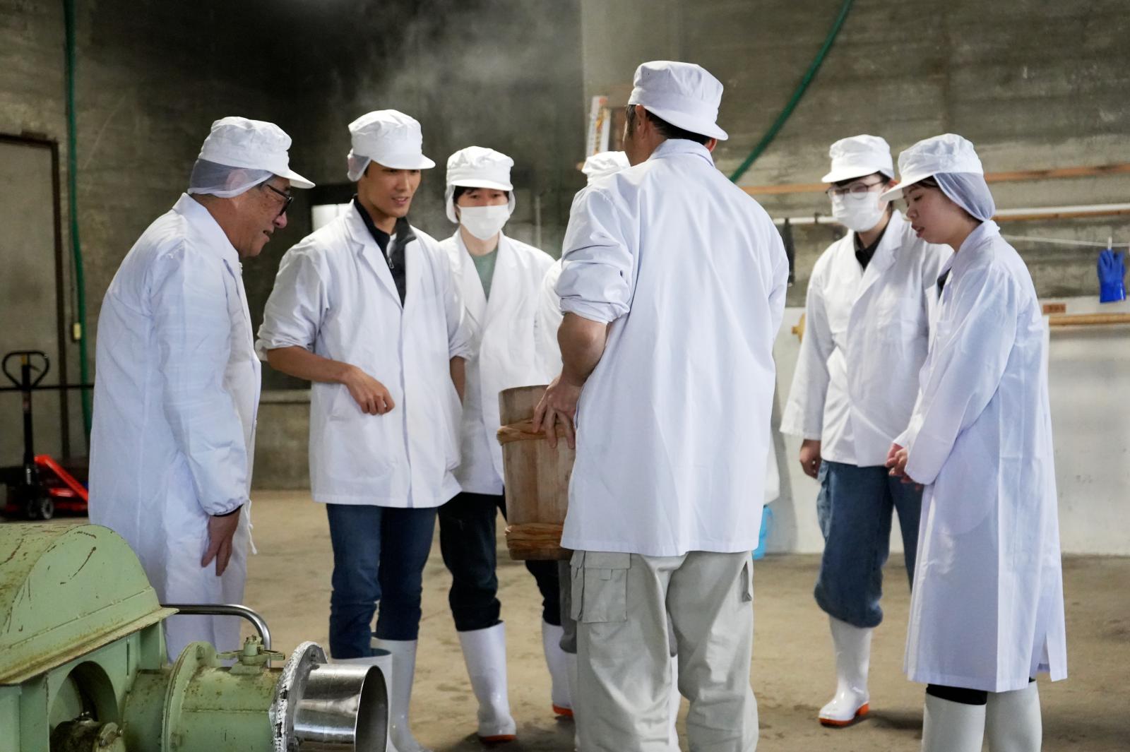 11月23日(土)、究プロジェクトのメンバー5人といつでも青春キャンパス・シニア大学生の渡辺謙吉さん(70歳)が参加し、日本酒造りの根幹となる「酒母づくり」を行いました。健全な酵母を培養し、力強い醪(もろみ)を育むための大切な作業で、杜氏や蔵人の皆さんのサポートのもと、細心の注意を払いながら、酒造りの基礎を固めました。