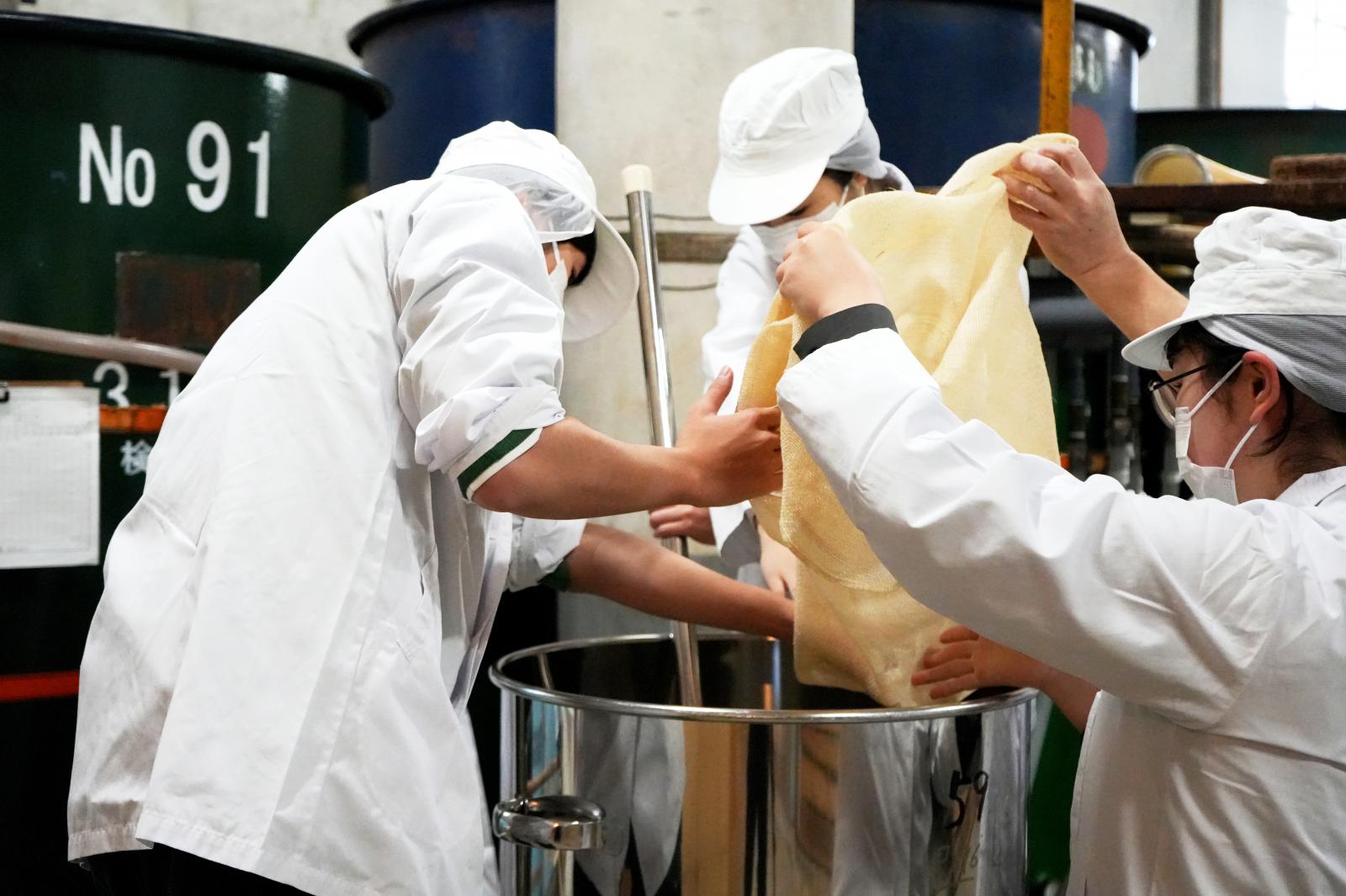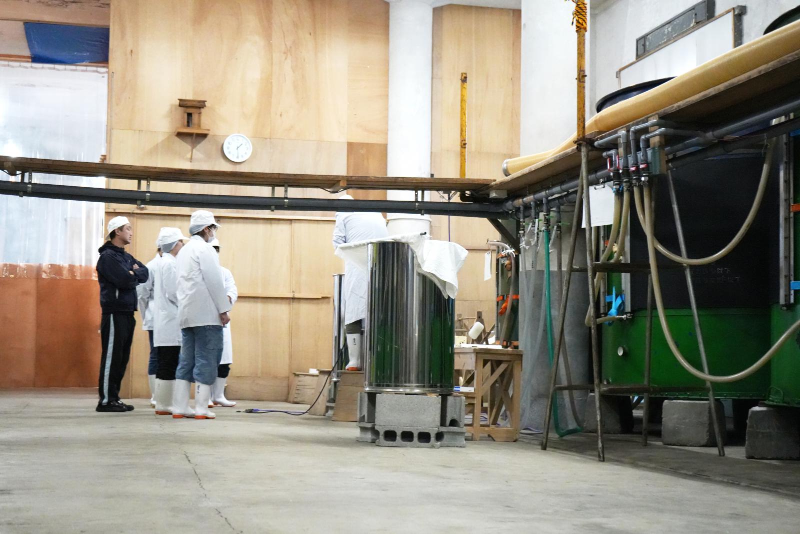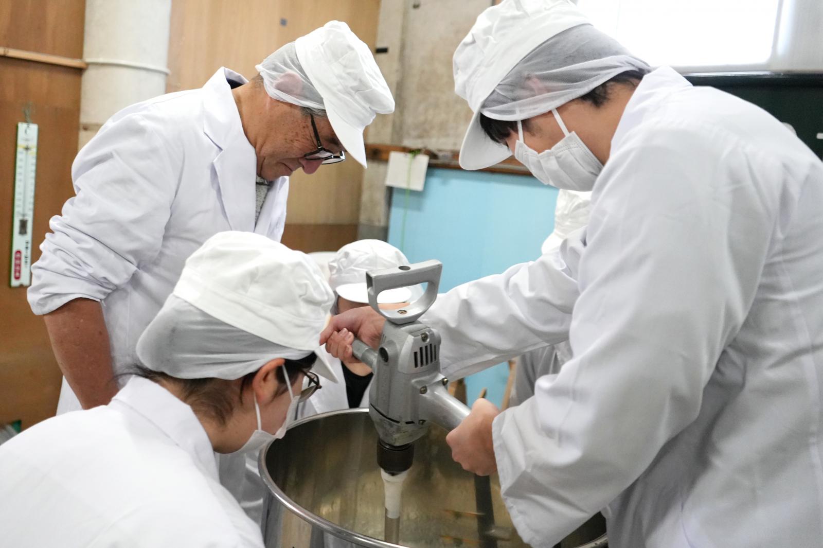 午前中は、蒸し上がった酒米を運搬し、固まりがない状態までに手でほぐすとともに、酵母や微生物の死滅を防ぐため、素早く均一に適温(通常 5~8℃程度)まで冷ます作業、さらには、酒母タンクに冷ました蒸米を投入するところまで行いました。午後からは、電動ドリルを用いて、蒸米、麹、仕込み水を強力に攪拌し、丁寧に「摺りつぶす」作業を実施しました。これにより、成分の偏りをなくし、酵母が活発に活動できる清潔で均一な酒母環境を迅速につくり上げることができます。タンク底の強い抵抗がある材料を長時間にわたり電動ドリルで攪拌し続ける作業は、想像以上の重労働でしたが、学生たちはドリルを全身で支え、強い力を込めて作業をやりきりました。学生の想いが詰まった酒母が、ここから約2週間〜1ヶ月かけてじっくりと育まれていきます。