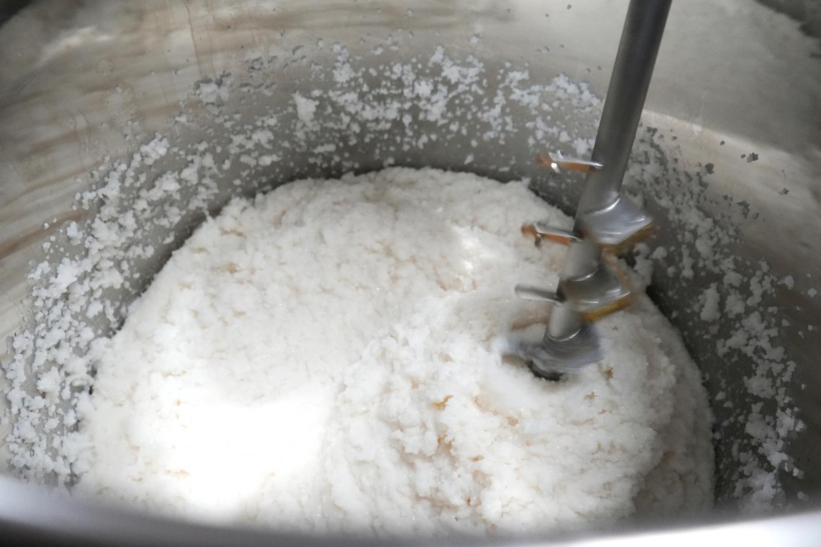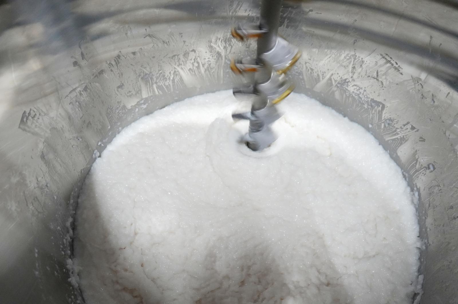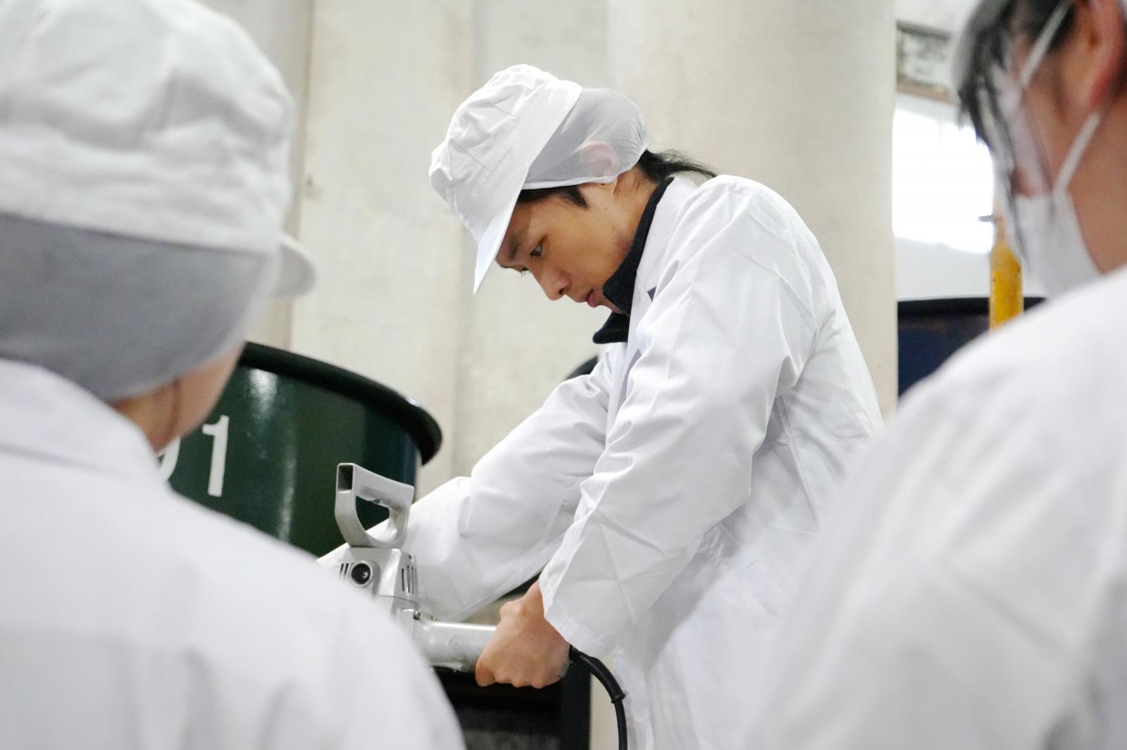 午前中は、蒸し上がった酒米を運搬し、固まりがない状態までに手でほぐすとともに、酵母や微生物の死滅を防ぐため、素早く均一に適温(通常 5~8℃程度)まで冷ます作業、さらには、酒母タンクに冷ました蒸米を投入するところまで行いました。午後からは、電動ドリルを用いて、蒸米、麹、仕込み水を強力に攪拌し、丁寧に「摺りつぶす」作業を実施しました。これにより、成分の偏りをなくし、酵母が活発に活動できる清潔で均一な酒母環境を迅速につくり上げることができます。タンク底の強い抵抗がある材料を長時間にわたり電動ドリルで攪拌し続ける作業は、想像以上の重労働でしたが、学生たちはドリルを全身で支え、強い力を込めて作業をやりきりました。学生の想いが詰まった酒母が、ここから約2週間〜1ヶ月かけてじっくりと育まれていきます。