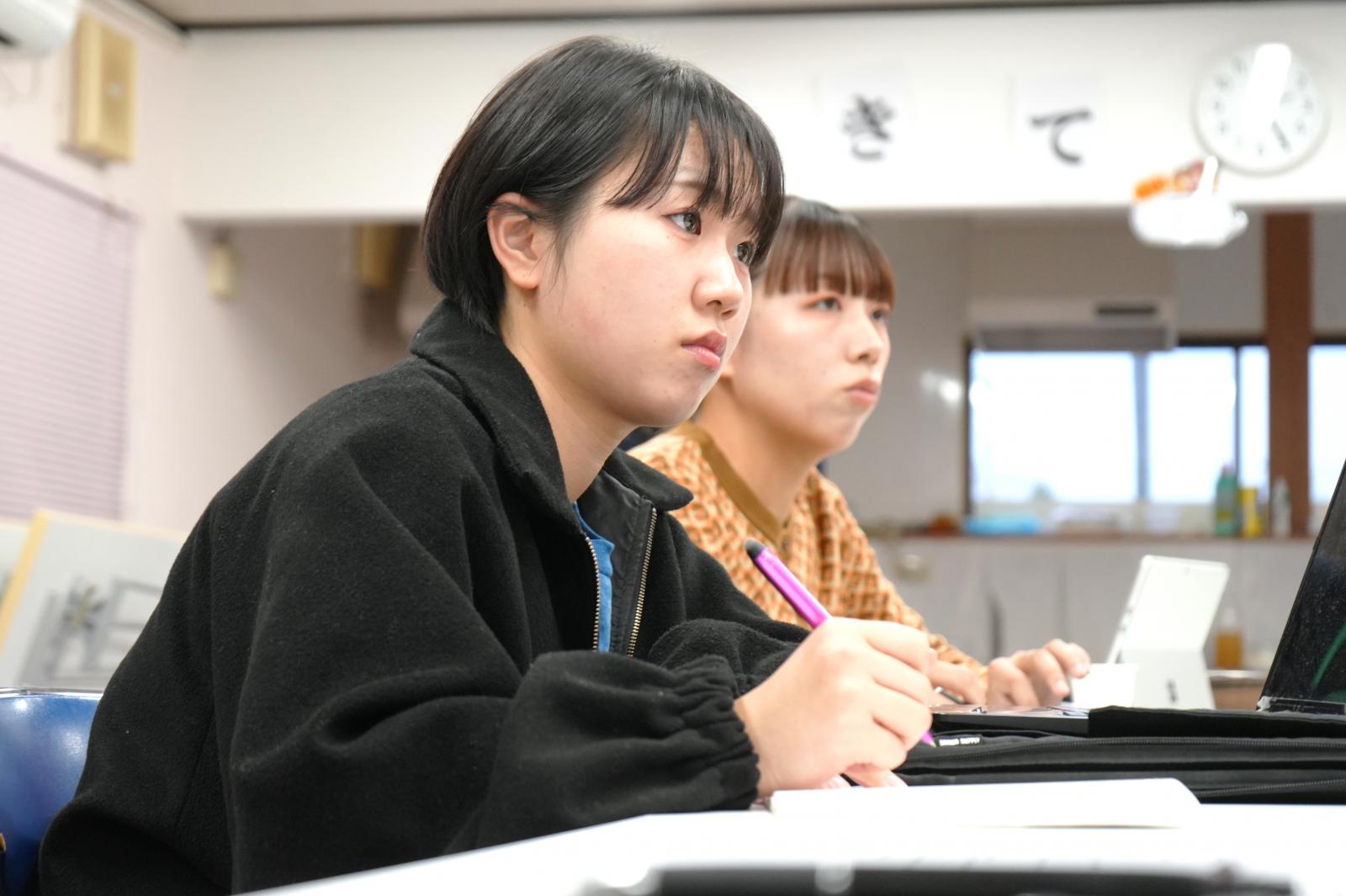 当日は、「陽気な母さんの店」の石垣一子会長と佐々木幹子代表取締役に対し、これまでの調査の状況を説明しました。学生たちは「これまで会員の農家の女性が生きがいや自己実現のために、自宅で加工した漬物を直売所で販売していた。しかし、高齢化により農産物を施設まで一人で運び込むのが難しくなり、食品衛生法改正を機に引退した人が多いのではないか」と分析しました。解決策として、「複数の農家会員で協力することで運搬の課題は解決できる。グループに分けて漬物を漬ける日時を合わせるということも考えられる。」さらに、学生たちからは、漬物加工所に専属の従業員を雇用する提案も出されました。その上で、漬物加工所を効率的に稼働させるためインターネット上でスケジュールを共有し、交代制で利用する仕組みを導入する案や、専従の従業員が直売所ならではの漬物を加工できるように「レシピ集」としてまとめるなどの提案を示しました。