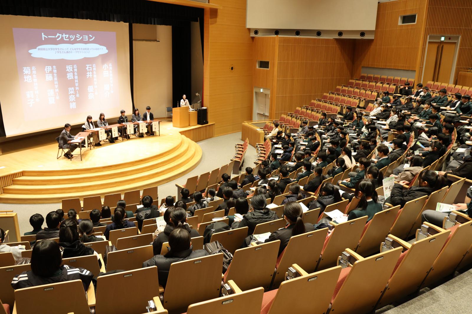 生物資源科学部1年の学生5名によるトークセッションと、学生自主研究発表が行われました。トークセッションでは、学部学科を選ぶ際のポイントや、大学生活での取り組みのほか、高校生から寄せられた多数の質問に答えるなど、進路選択の参考になる有意義な機会となりました。応用生物科学科1年の菊地 莉子さん(御所野学院高校卒)からは、自身の高校生活での経験を交えて、高校生へ応援のメッセージを送られ、高校生は輝く先輩の姿に、大学生活への期待を膨らませたようでした。