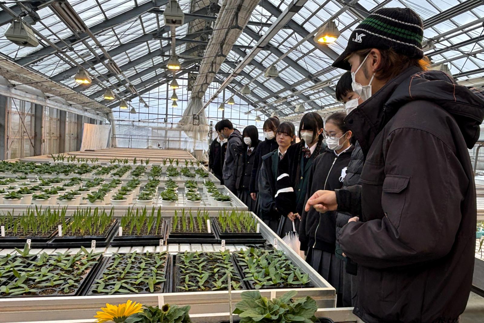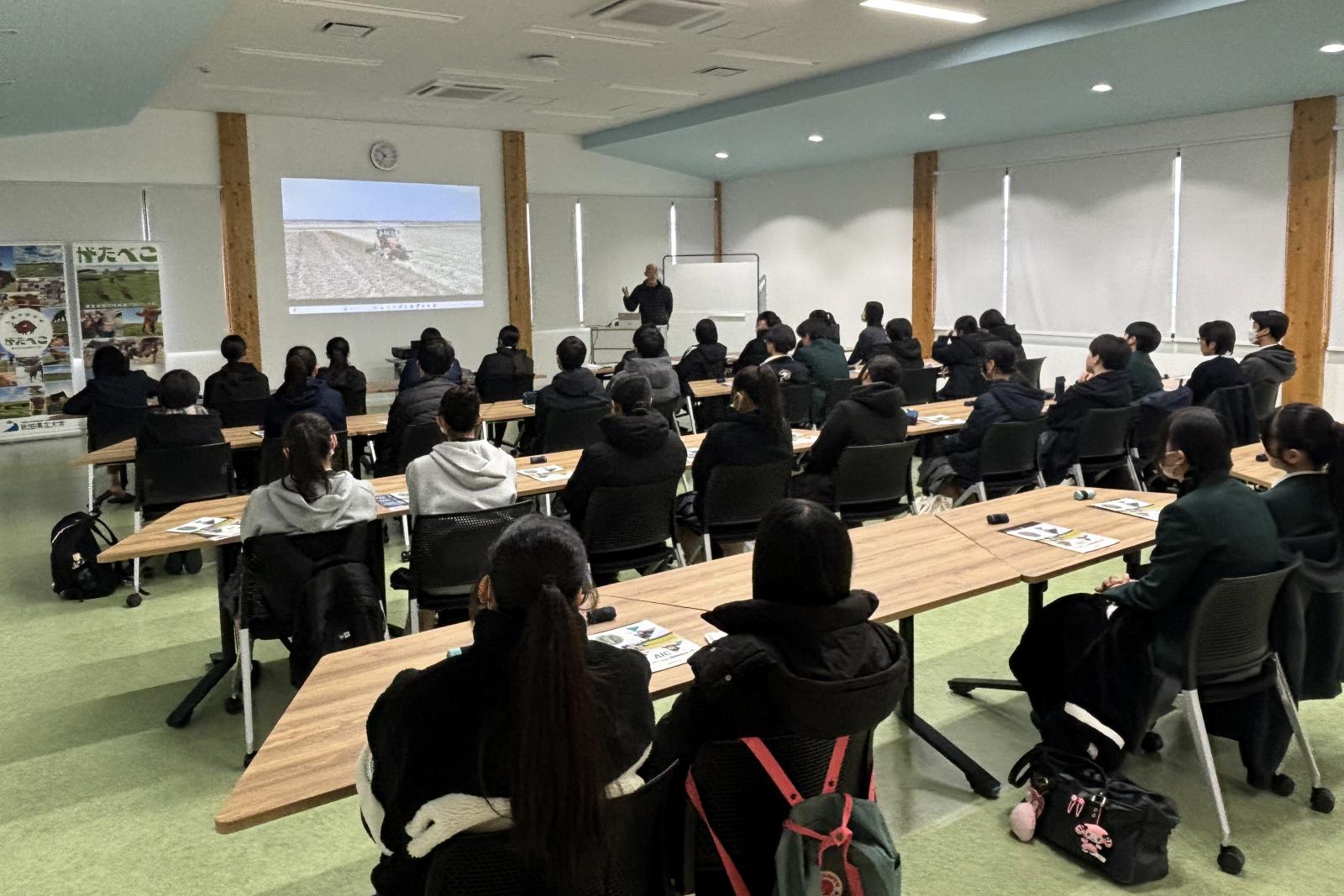 はじめに、AICの概要説明と秋田の農業の現状やAICが取り組むスマート農業についての説明がありました。高校生は熱心に耳を傾け、質問をしたりメモをとるなどして理解を深めていました。施設見学では、園芸温室、牛舎、スマート農機の展示など、AICの特長的な施設・設備を見学しました。スマート農機の紹介では、ロボットトラクターや農業用ドローンの実演があり、最先端農業技術がどのように活かされているのかを間近で体感しました。