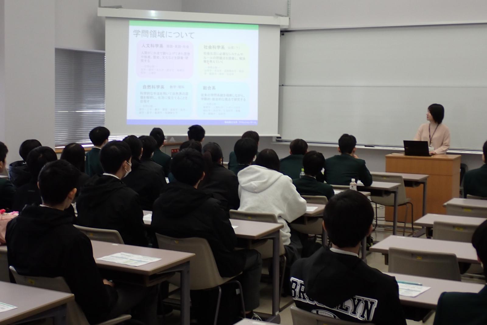11月19日(水)、秋田市立御所野学院高校1、2年生の113名が本学を見学しました。今回の訪問は、実際に大学を見学し、将来の進路について考え、学習意欲を高めることを目的に実施されました。