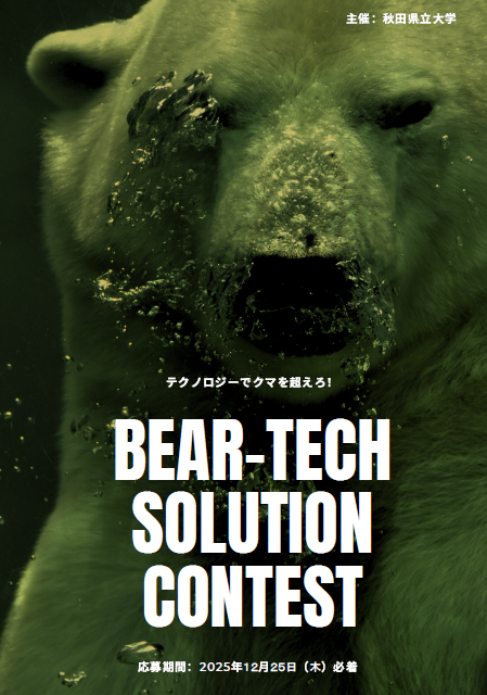 近年、秋田県内をはじめとする広範囲でクマの出没が急増し、人身被害が多発しています。これは、地域住民の生活、安全、そして里山環境の維持に関わる、極めて深刻な社会問題となっています。本学ではこの喫緊の課題に対し、柔軟で創造的なアイデアを結集し、テクノロジーの視点から新しい解決策を創出するため、本学の教職員・学生を対象とした「Bear-Tech Solution コンテスト」を開催しています。