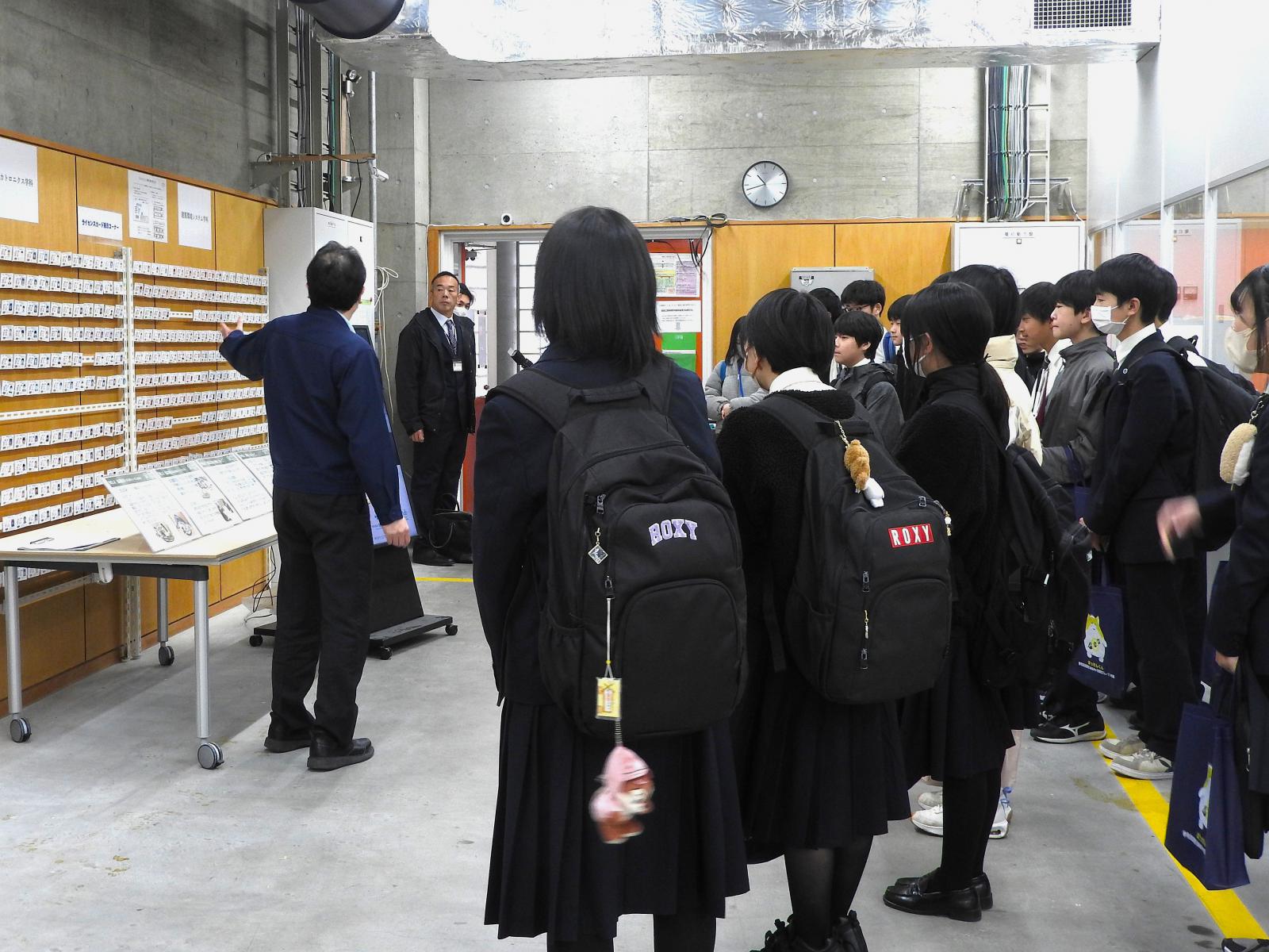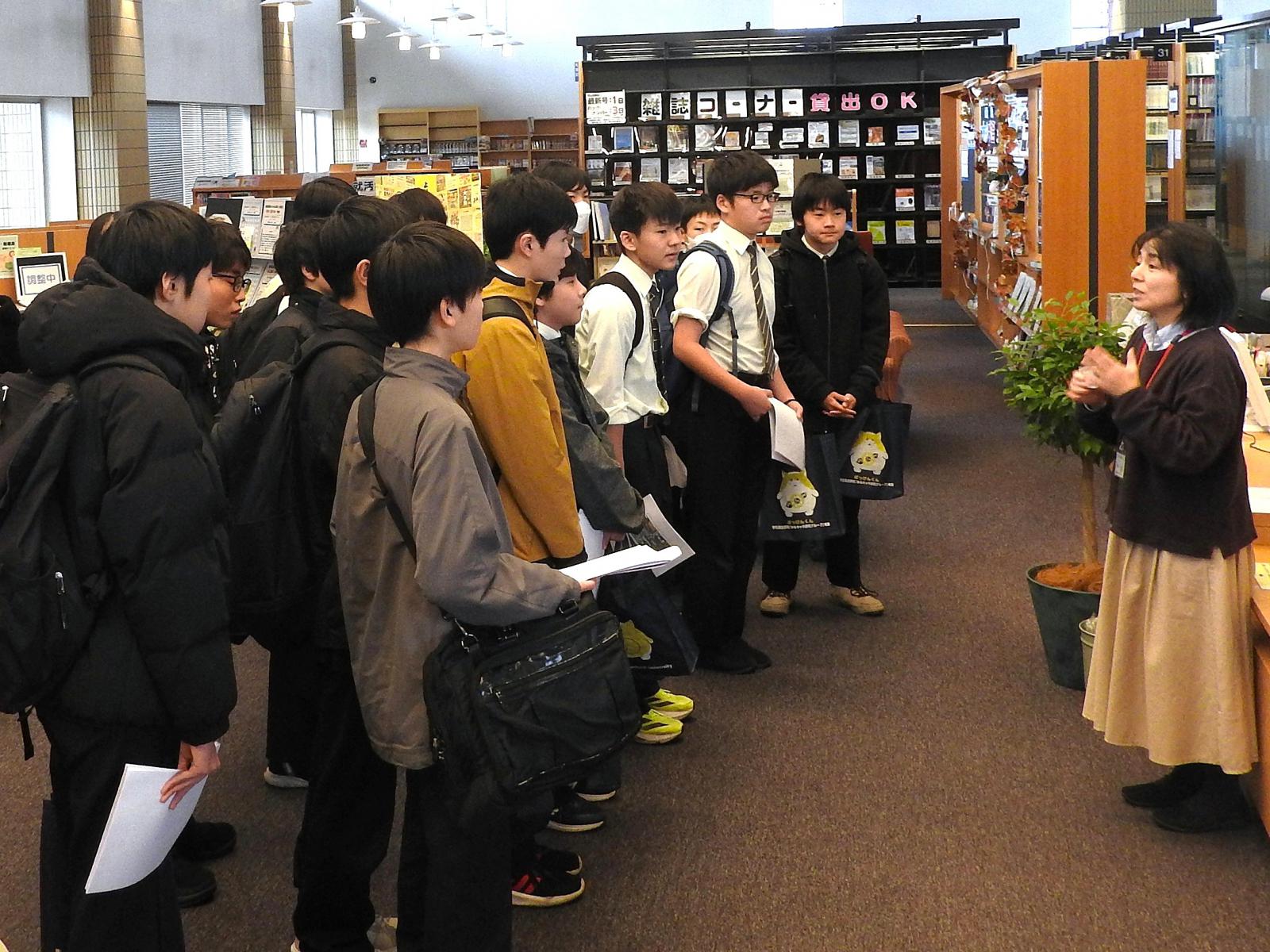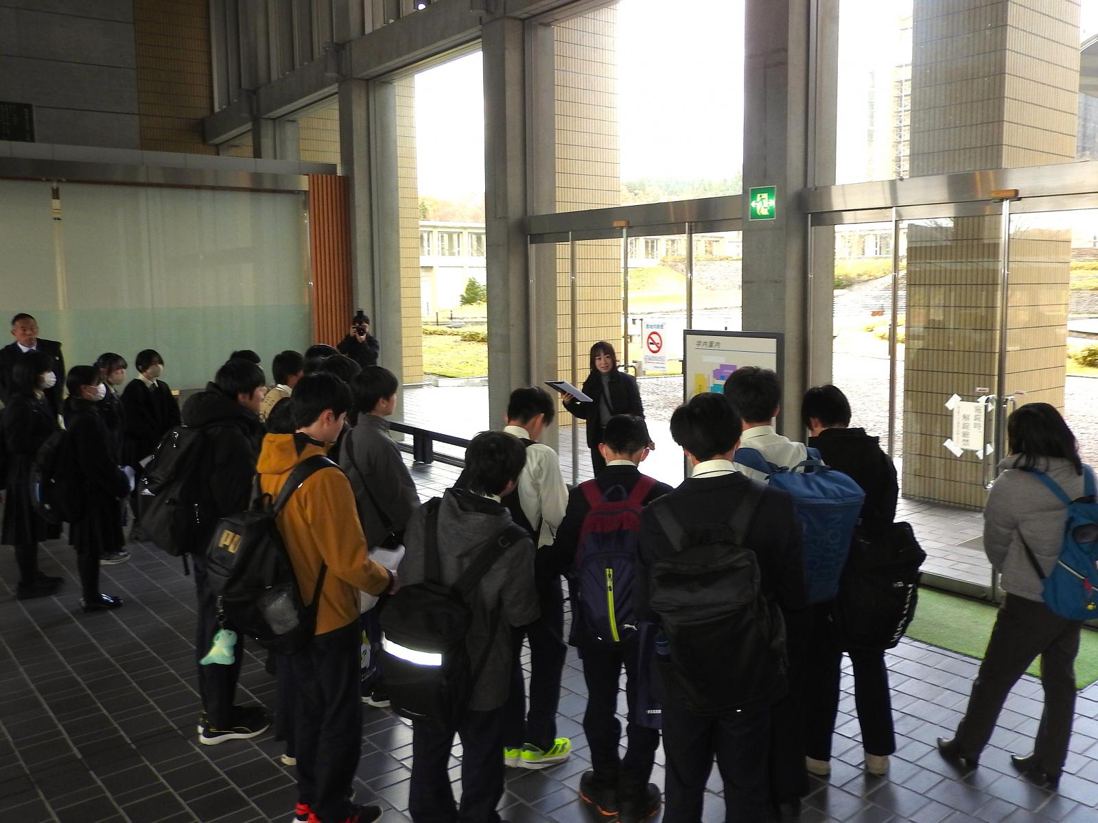 11月18日(火)、横手清陵学院中学校2年生の皆さんが校外学習の一環として本荘キャンパスを訪れました。はじめに正面玄関にて本学の概要説明を行い、その後、約1時間にわたりキャンパス見学を実施しました。見学では、広々とした施設や実験・実習で使用する機器に興味を示す生徒さんの姿が多く見られました。図書館では蔵書数の多さに驚く声が上がったほか、普段なじみのあるコミックが英語で展示されているのを見て、「英語を楽しく勉強できそう」といった声も聞かれました。
