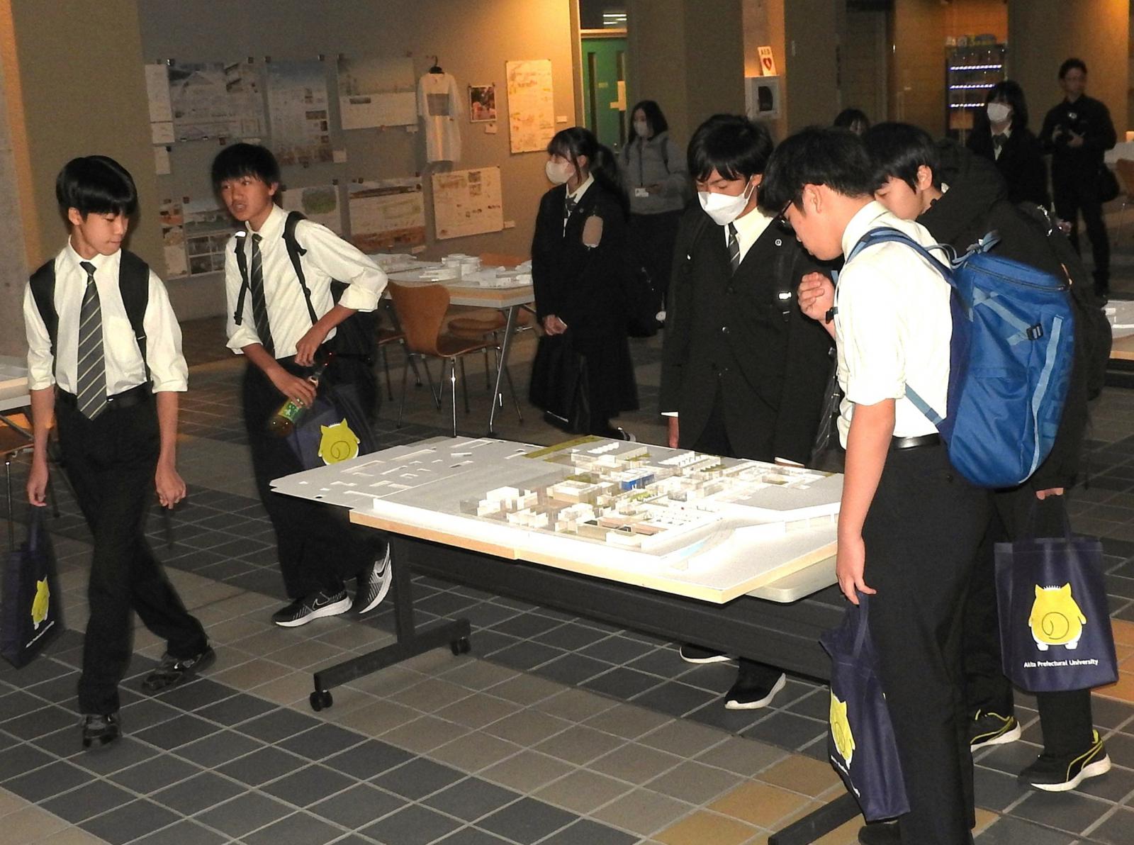 後半の見学では、県内出身の本学学生と合流し、学生生活について具体的なイメージを持っていただきました。学部棟や特別実験棟、創造工房棟など、研究やものづくりを行う施設を巡り、学生が作成した建築模型を観察したり、段ボールで作られた椅子に座ってみたりするなど、本学での学びの雰囲気を体感していただきました。
