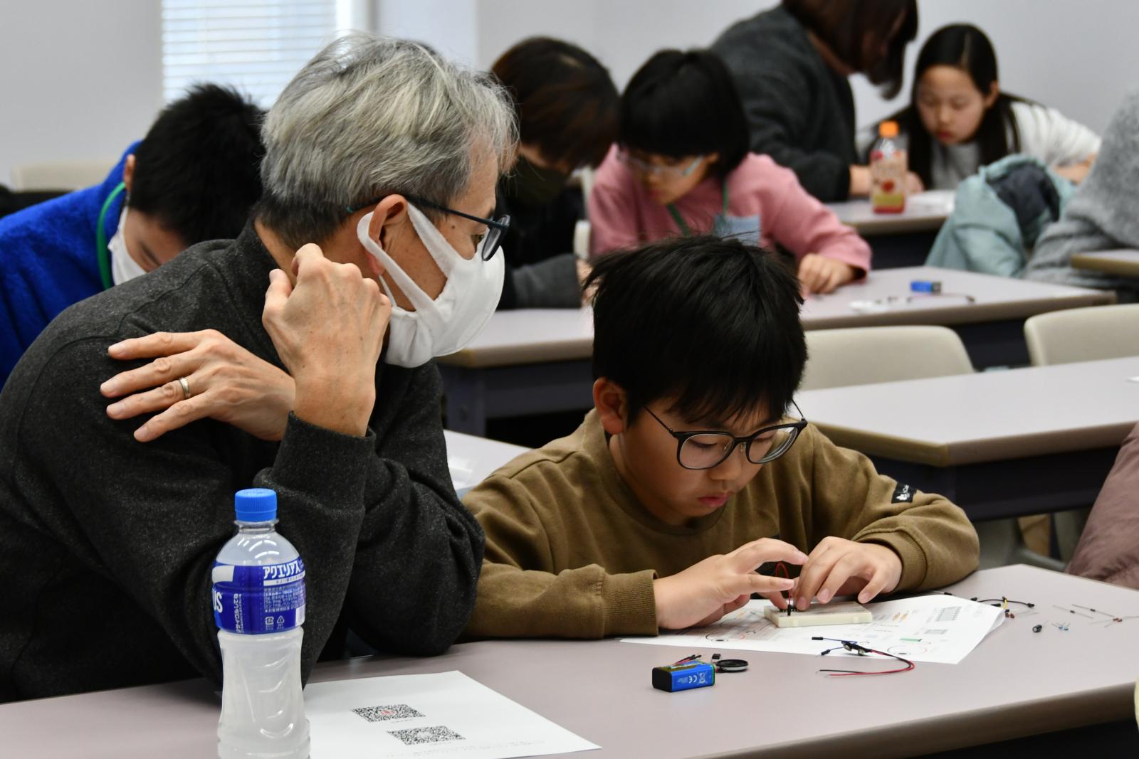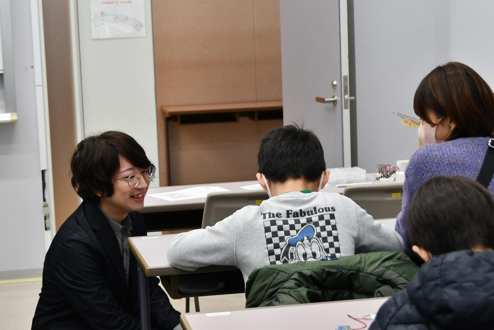 その後、今回使用するICチップや電池、スピーカーなどの電子部品について説明を受け、実際に回路を組み立てて音を出す活動に取り組みました。児童たちは、講師やボランティア学生のサポートを受けながら、慎重に電子回路を作成しました。明るさを工夫することで音程が変わることも体験し、それぞれが自分だけの電子楽器を完成させました。