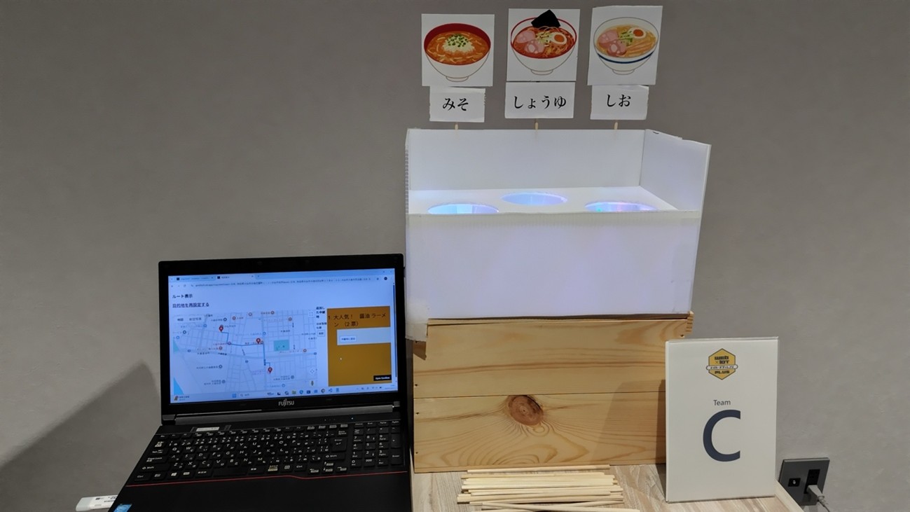 審査の結果、情報工学科1年川上洸世さんの所属するチームD (作品名:きりたんチャンバラ)が最優秀賞に選ばれました。また、経営システム工学科3年木佐貫結菜さんの所属するチームC (作品名:寄り道VOTE)が特別賞に選ばれました。