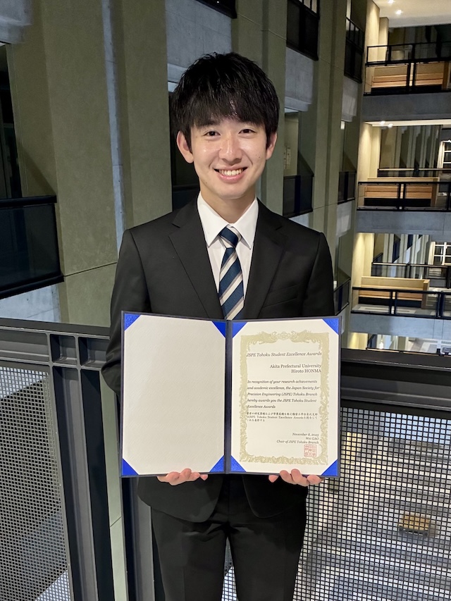 令和7年11月8日に秋田県立大学本荘キャンパスで開催された2025年度精密工学会東北支部学術講演会において、システム科学技術研究科・博士前期課程/先端加工技術研究室の大学院生2名が表彰されました。・本間裕人さん:JSPE Tohoku Student Excellence Awards