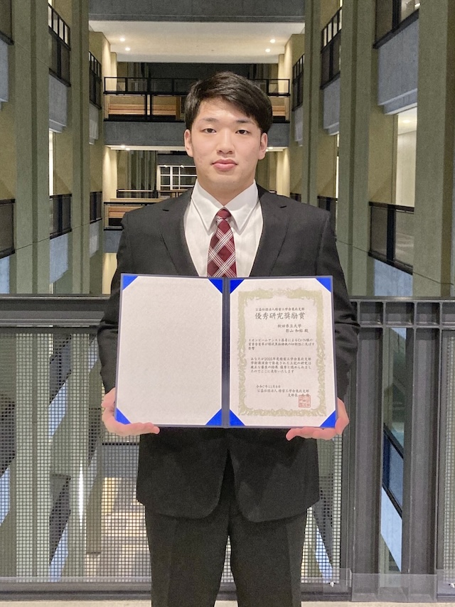 この度、2025年度精密工学会東北支部学術講演会において優秀研究奨励賞を受賞することができ、大変光栄に存じます。本研究を進めるにあたり、ご指導くださいました鈴木庸久先生、藤井達也先生、野村光由先生をはじめ、研究室の皆様に心より感謝申し上げます。本賞を励みに、今後も真摯な姿勢で研究に取り組み、より一層の理解と発展を目指して努力を重ねてまいります。
