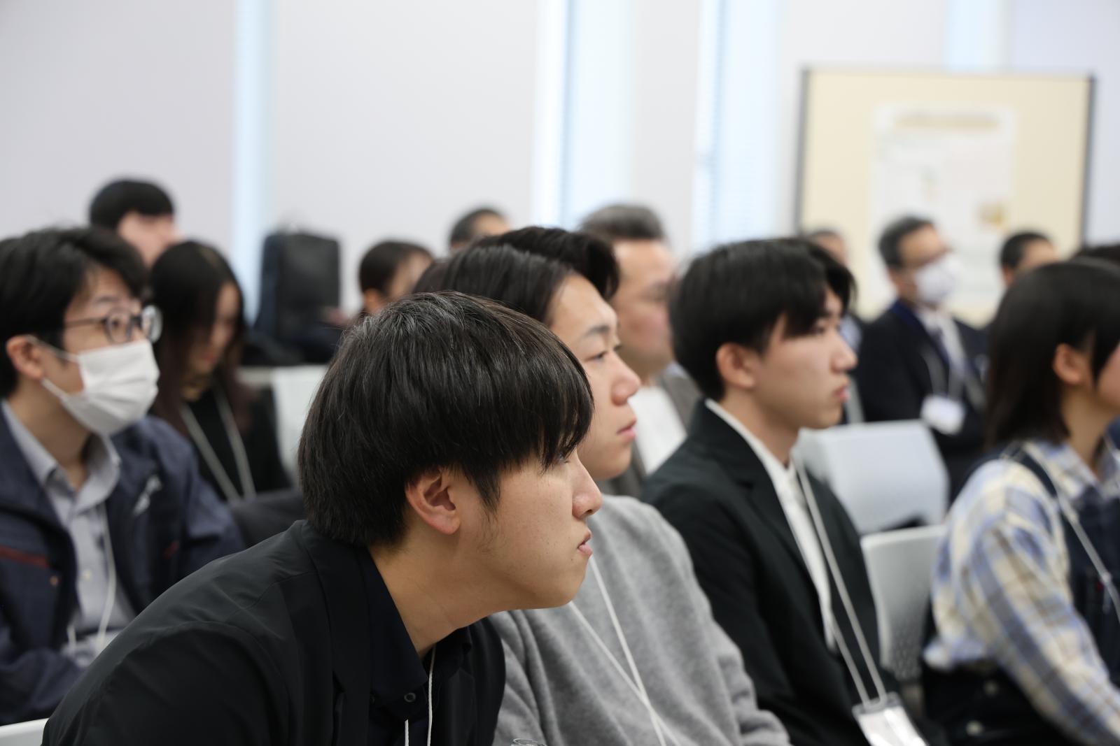 発表後には、ポスターを自由に閲覧できる時間が設けられ、協力団体の皆様と発表を終えた学生たちが、リラックスした雰囲気の中で終始和やかに意見交換を行う様子が見られました。協力団体からは、「社内では思いつかない、学生ならではの視点やアイディア、そして着地点に驚かされた」「学生と活動する中で非常に勉強になった。来年度以降も引き続き一緒に取り組みたい」「初の試みに不安もあったが、学生の優秀さに感銘を受け、秋田県立大学の学生の高い能力を実感した」などのコメントが寄せられました。
