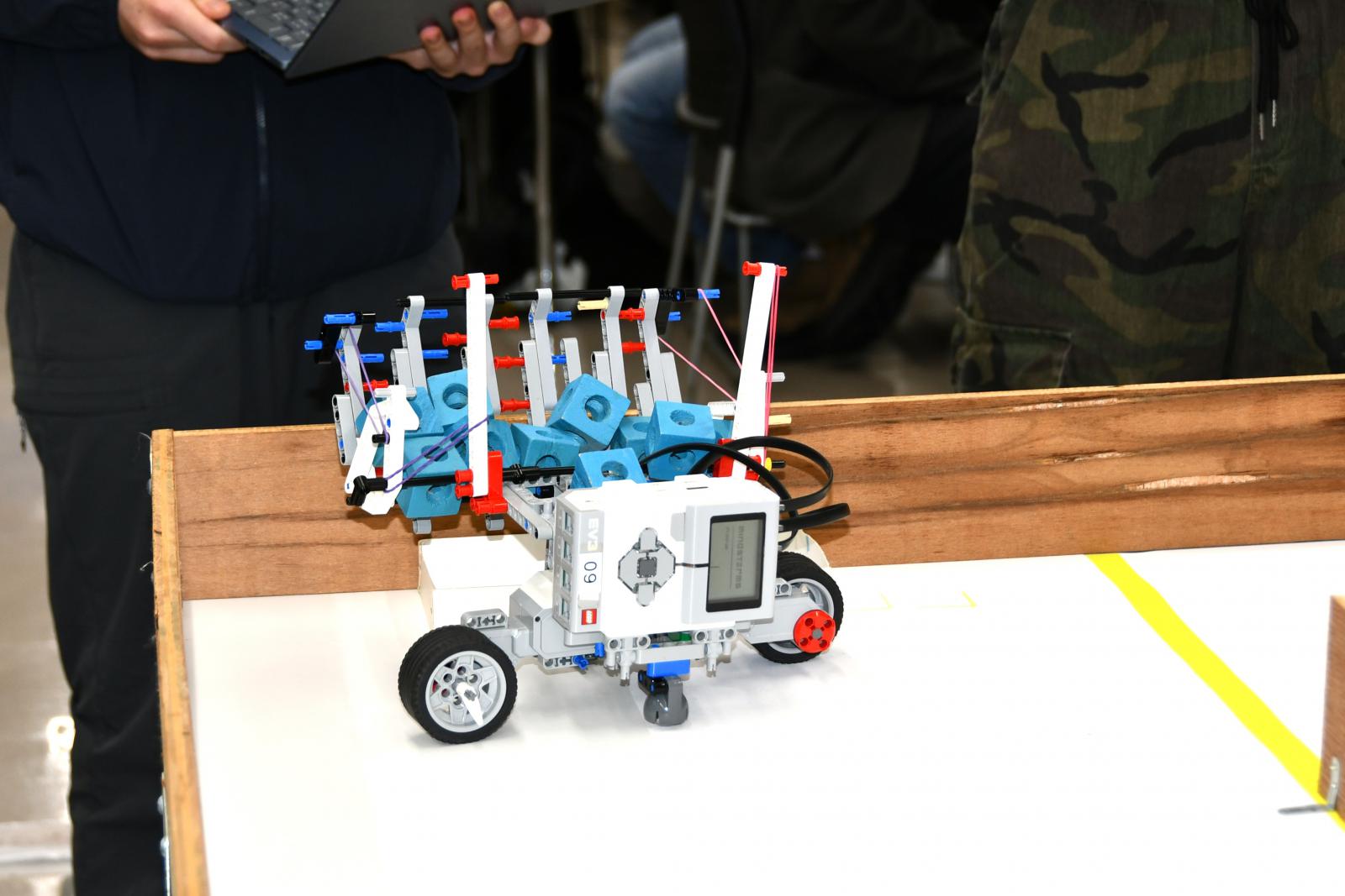 競技では、雪を模擬したブロックを建築模型の屋根から下ろし、雪捨てエリアへ運ぶことで得点を競います。各チームはロボットの性能を最大限に発揮させるだけでなく、得点を伸ばすための作戦にも工夫を凝らし、白熱した競技が繰り広げられました。