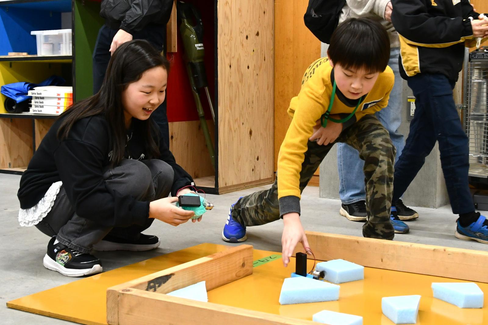 マシン完成後は、創造工房特製のレースコースで競争したり、障害物のある迷路コースに挑戦したりしながら、ゴールまでのタイムを競い、大いに盛り上がりました。