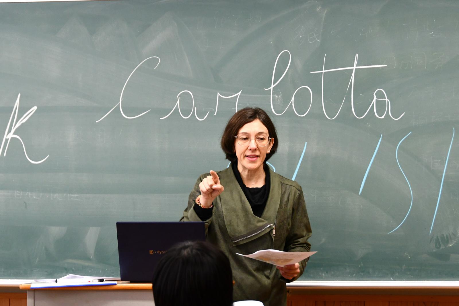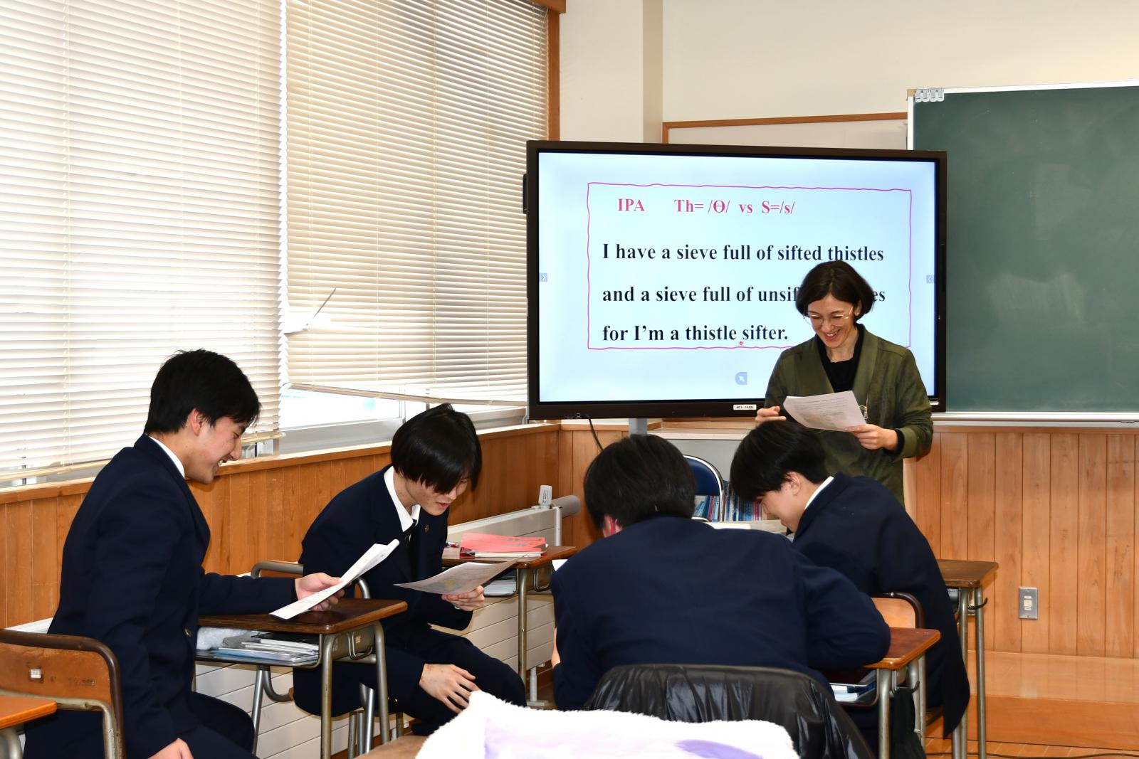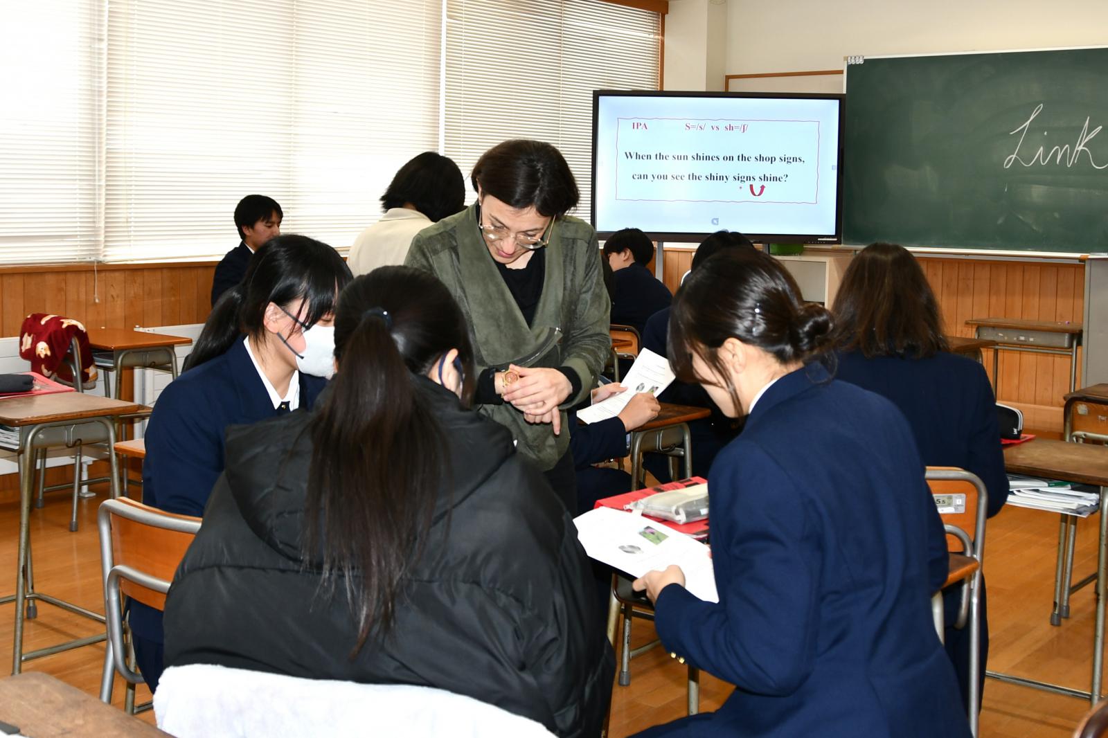 令和8年2月3日、由利高校にて、来年度国際科を選択予定の1年生を対象に、本学総合科学教育研究センターのアヴァンツィ・マリア・カルロッタ助教による高大連携授業が行われました。授業は、カルロッタ助教の自己紹介に続き、早口言葉を使った発音練習からスタートしました。早口言葉は発音練習にぴったりで、まずはゆっくり丁寧に声に出して読んでみました。学生たちは、カタカナ表記に頼らず、ネイティブの発音を意識しながら繰り返し音読し、3人ずつのグループで練習しました。