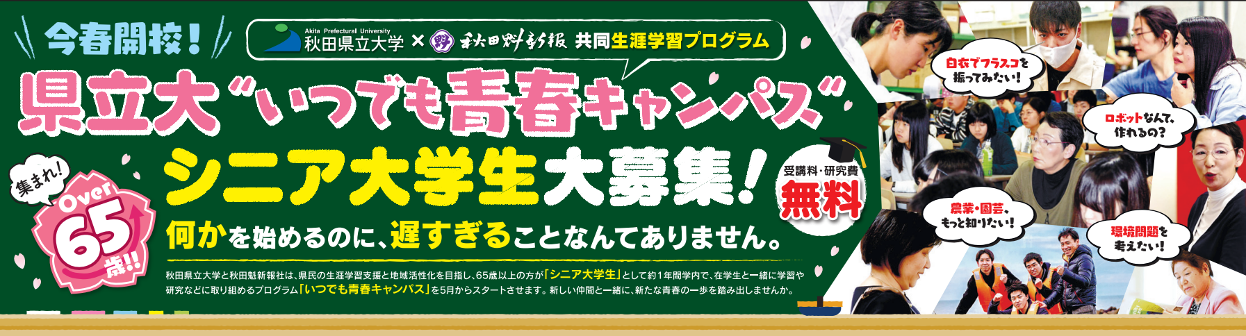 秋田県立大学と秋田魁新報では、65歳以上の方を「シニア大学生」として1年間、本学で受け入れ、在学生と一緒に学習や研究、課外活動に取り組めるプログラム『いつでも青春キャンパス』を、令和5年5月にスタートさせます。シニア大学生の活躍は随時、大学ホームページや秋田魁新聞等でご紹介させていただきます。ご期待ください!!
