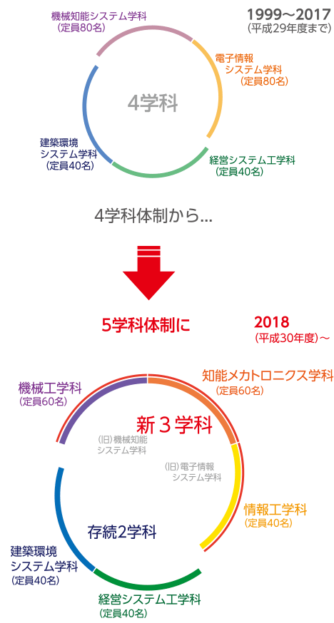 「秋田県の持続的発展に貢献」することを理念とする県立大学においては、こうした県のビジョンに呼応し、地域が必要とする専門人材の育成や若者の県内定着等を促進するため、平成30年度からスタートする大学全体の次期中期計画に先立ち、システム科学技術学部の学科再編に着手し、①制御系に関して機械と電子の両方が分かる人材の輩出、 ②今後伸びることが予想される社会インフラ系、メカトロニクス系、知的情報産業への人材の輩出を目指すこととしました。