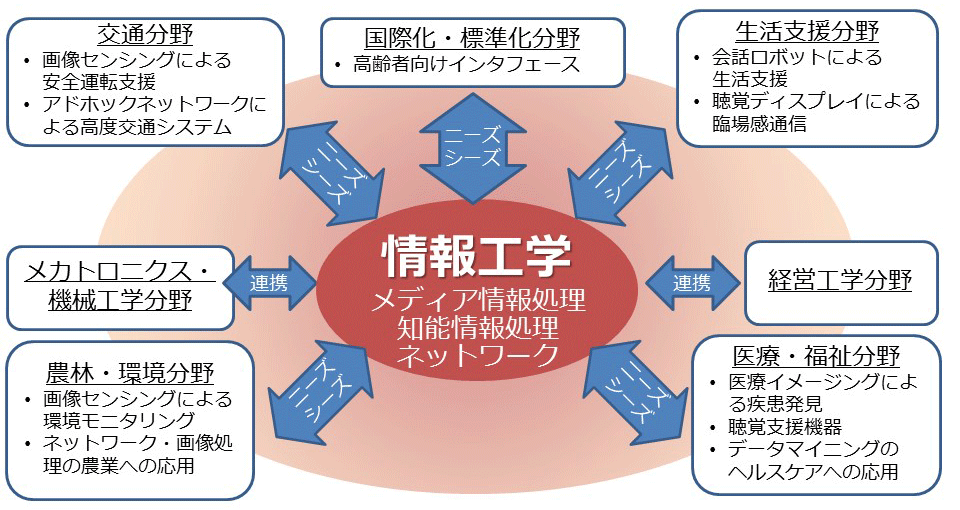 近年、日常の生活空間から生産の場まで様々な場面で情報技術の利用が広まっています。私たちの身の回りにあるスマートフォン、家電製品、自動車、建築物などには多くのコンピュータや情報機器が組み込まれており、ものづくりの現場では効率的な工場生産を実現するため高度な情報技術が活用されています。本学科では、情報工学を基盤として、現実世界の多種多様で大量な情報を活用して、人を援ける賢い情報システムを創出できることを目的とした教育と研究を行います。カリキュラムは標準的な情報工学の学問を基礎に、現実世界の様々な情報を活用した知的な人間支援を実現するために必要となる、メディア情報処理、知能情報処理、情報ネットワークシステムに重点を置いたカリキュラムを組んでいます。また、農業・生活支援・健康・交通・エネルギー等の分野において,社会の幅広いニーズを満たす情報システムを設計・開発・運用できる実践的な人材の育成に力を入れます。