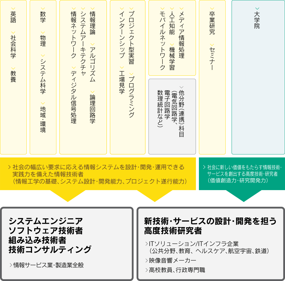 教育:社会の幅広い要求に応える情報システムを設計・開発・運用できる実践的な能力を身に付けた人材を養成