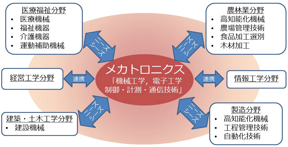 産業を支える技術者の実践的教育や制御を基幹技術とする機械・電子・通信などの分野を融合した応用システムに関する教育と研究を行います。機械工学と電気電子工学及び制御工学を中心とした専門科目や、システム思考に基づいてこれらの技術を組み合わせたメカトロニクスに関する科目について、プロジェクト型実習を中心として少人数教育を実施し、産業分野で応用できる問題発見・解決力を備えた人材を育てることを目標にしています。さらに、メカトロニクスに関する技術を体系的に修得できる学習を履修モデルとして提示し、国際化に対応できるコミュニケーション能力を育成します。