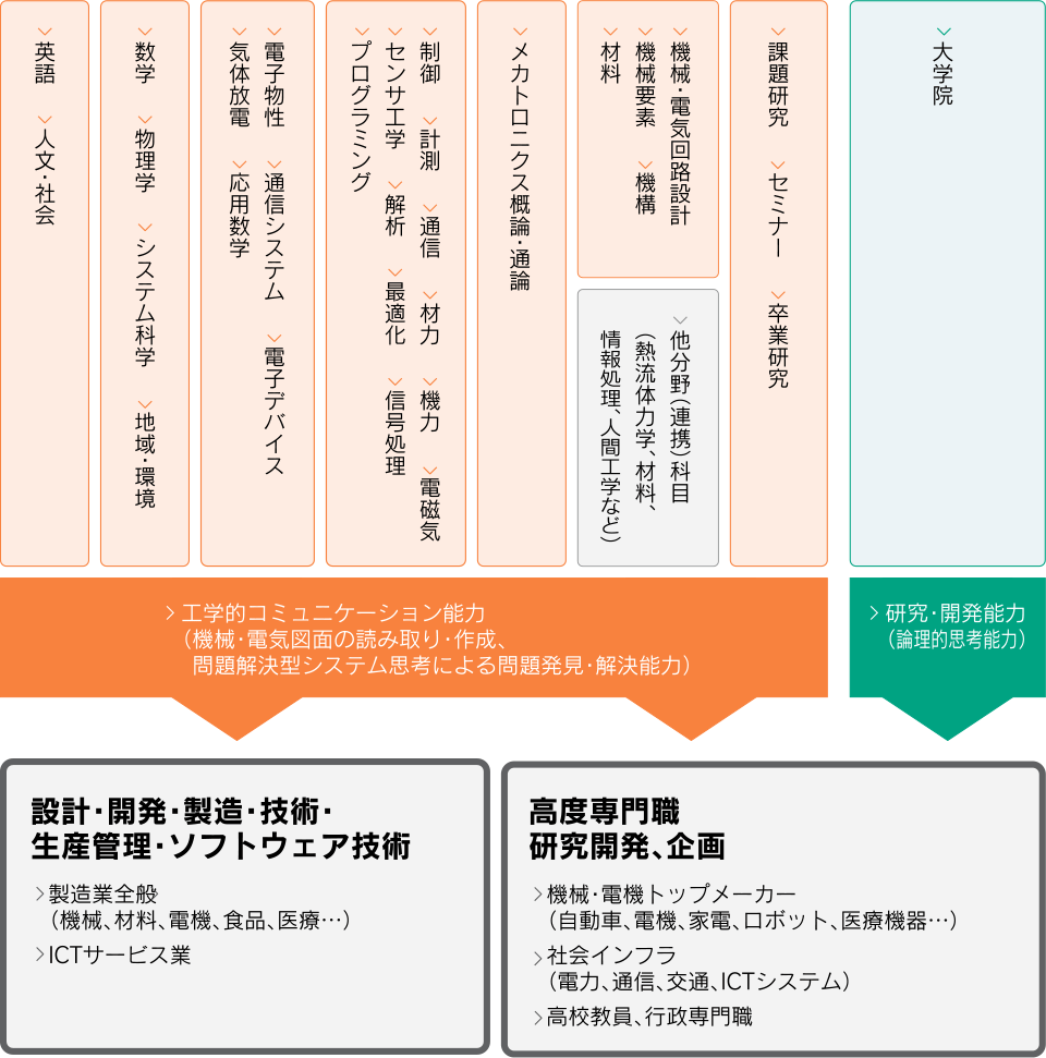 ・機械工学と電子工学、制御工学に関する専門知識を有し、機械・電子・通信などの分野を融合したメカトロニクスをシステム思考に基づいて設計・開発でき、将来の産業に貢献できる実践的な技術者を育成する