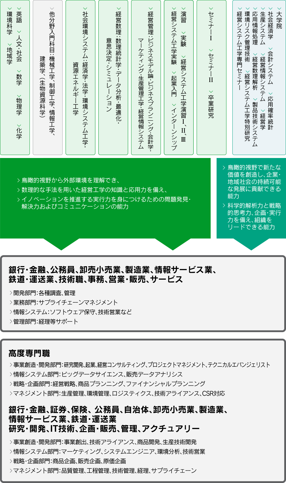・鳥瞰的視野から外部環境を理解でき、数理的な手法を用いた経営工学の知識と応用力を備え、イノベーションを推進する実行力を身につけるための問題発見・解決力およびコミュニケーションの能力を備えた人材を育成