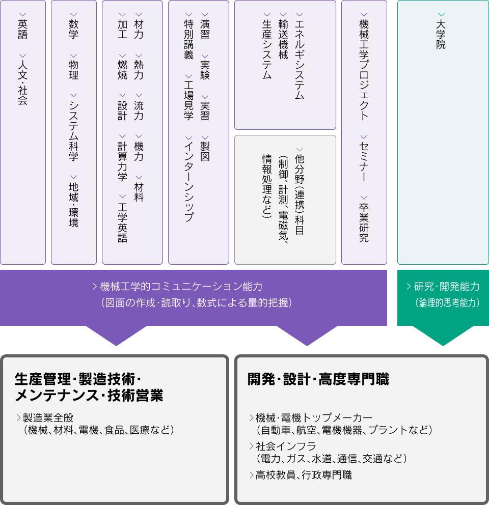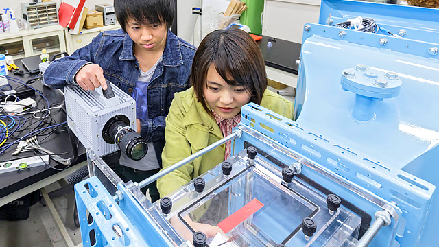 地球資源・エネルギーの有効活用による、人と環境に優しい高度機械システムに関する教育と研究を行います。教育では、機械工学の基礎をなす材料力学、熱力学、流体力学、機械力学を重視し、ものづくりに必要な知識と技術を修得するための授業を行います。また、プロジェクト型授業などを導入し、“機械屋”としてのセンス・実践力を養います。エネルギーシステム、輸送機械、生産システムを対象に社会での機械と人間の役割・責任分担を理解し、システム思考によって個々の専門分野の有機的結合を行います。そして、問題発見・解決型実践的学習を通して、地域の社会基盤を支える実践的技術者の育成を行います。