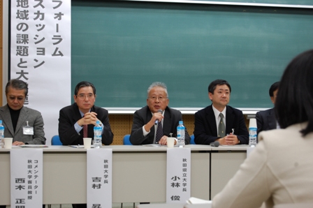 第二部では、秋田県内各大学の学長及び代表者らによるパネルディスカッションが行われ、本学からは小林俊一学長がパネリストとして参加しました。テーマを「地域の課題と大学連携の役割」とし、来場の方からの質問に答えていくかたちで進められ、秋田を含め昨今の厳しい状況の中、いかに大学間連携を高めて地域貢献ができるか議論されました。