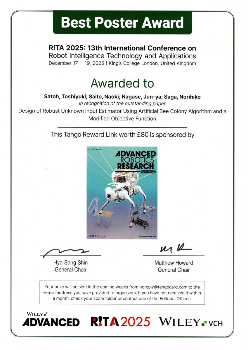 2025年12月に開催された国際会議International Conference on Robot Intelligence Technology and Applications(RITA 2025)において、本学教員がBest poster awardを受賞しました。