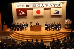 平成27年4月6日(月)に秋田キャンパス講堂にて、平成27年度秋田県立大学入学式が執り行われ、学部生405名、大学院生90名、学部編入生1名が入学を許可されました。小間篤学長は「1年生の時から大学生活全体の設計を心がけ、世界で活躍できる人材に育って欲しい」と式辞を述べました。続いて来賓祝辞として、佐竹敬久秋田県知事よりご祝辞をいただきました。