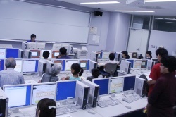 「プログラミングを体験しよう」では、文部科学省が提供する「プログラミン」というIT教育環境を利用して、実際にプログラミングを体験していただきました。このテーマでは、教職課程を履修している学生たちが教材づくりから当日の授業までを担当し、教職課程で学んだ知識を実践する場にもなっています。参加者は講師役の学生が提示した例題(画面上の犬の絵をプログラミングで上下左右に動かす)と同様のプログラムを親子で協力して作成しました。初めて取り組むプログラミングに苦戦する子どももいましたが、最後は皆、夢中になってプログラミングに取り組んでいました。