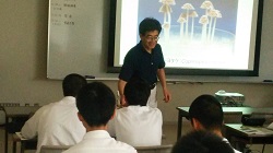 生物資源科学部の村口元准教授(応用生物科学科)の「きのこの遺伝子研究」についての講義では、村口准教授が実際に培養しているウシグソヒトヨタケをご覧いただき、専門的な菌界についてお話しました。少し難しかったようですが、中学生からは、様々な実験をしてみたいという感想をいただきました。