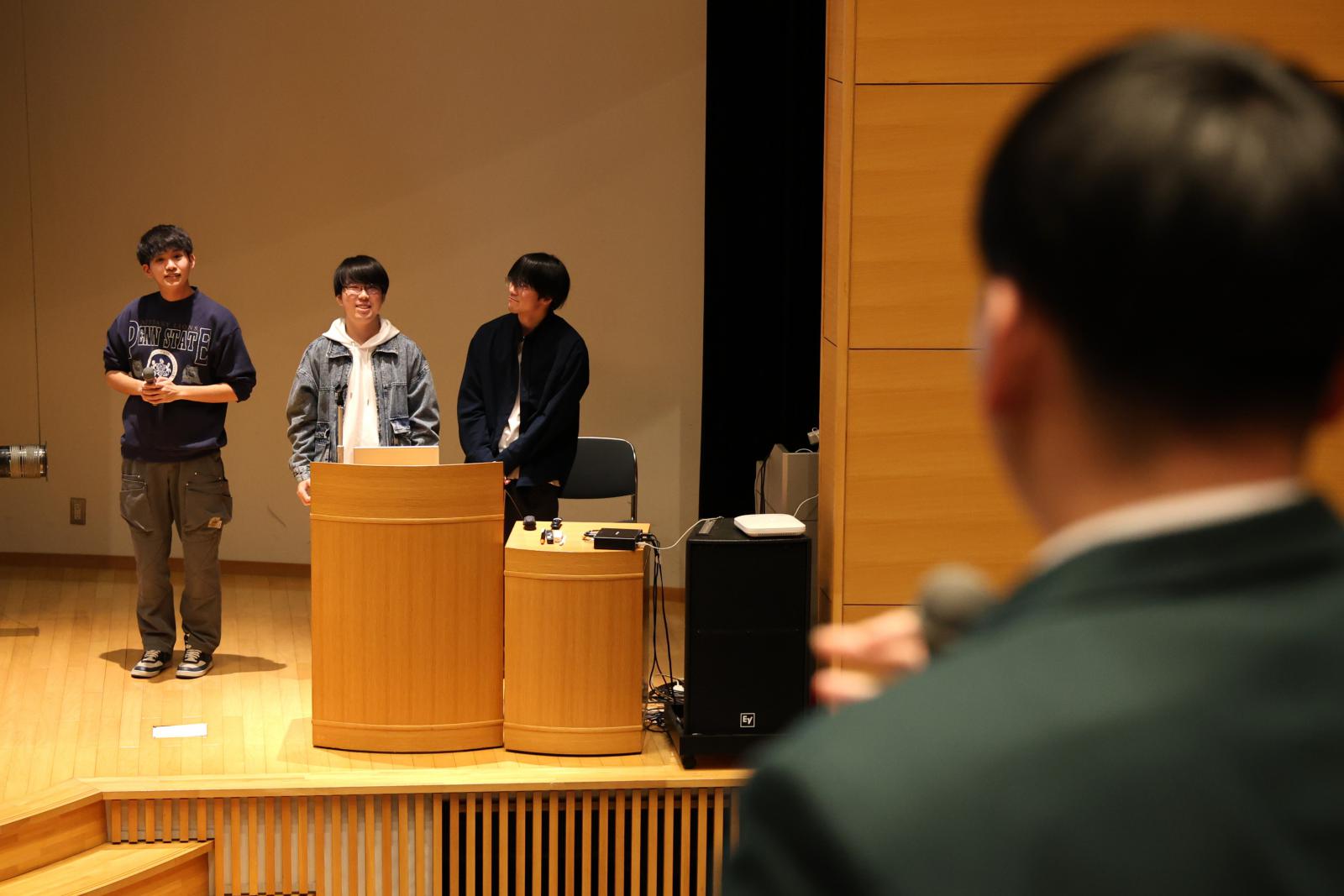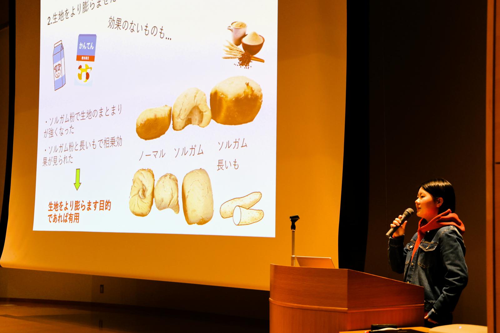 学生自主研究発表では、生物生産科学科3年の3名から「アボカドの食べ頃を非破壊で予測する方法の検討」、応用生物科学科3年の学生から「酵母からこだわった秋田独自の美味しい米粉パンの開発」の発表がありました。研究成果の発表のほか、早い段階から研究に取り組める環境の利点についても紹介しました。