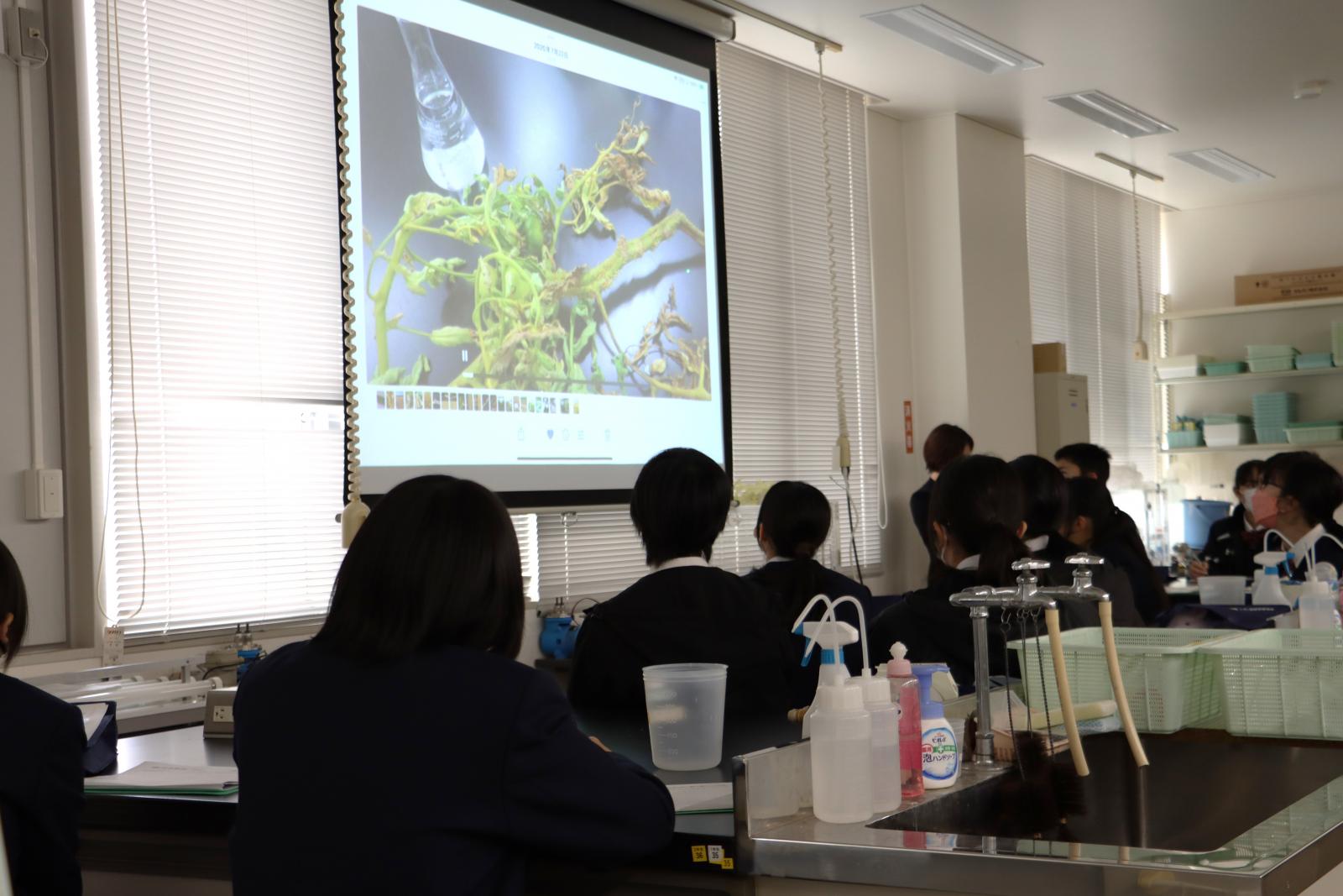 生物生産科学科の藤 晋一教授[専門:植物病理学]による模擬講義『農家を助ける植物のお医者さん』を受講しました。藤教授からは、イネいもち病やウイルス・細菌による植物の病気など、植物の病原菌に関する研究について説明がありました。中学の授業で習う内容に触れながら、農作物の病害が引き起こした飢饉について学び、植物が病気になる原因・背景について考えました。中学生は、藤教授からの問いかけに元気よく反応し、熱心にメモをとる様子が見られました。楽しみながら、植物の生態への理解を深める貴重な時間となりました。施設見学