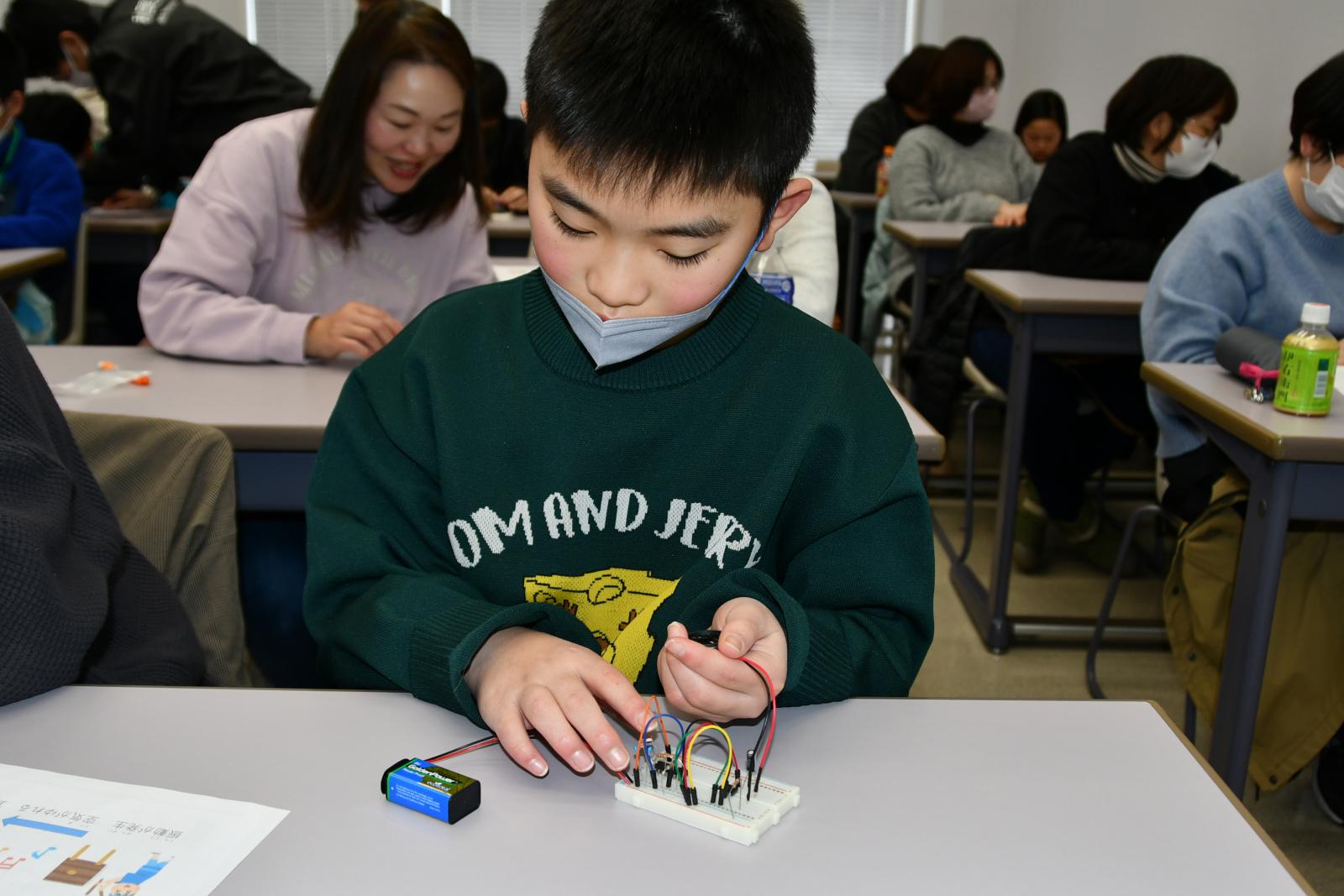 その後、今回使用するICチップや電池、スピーカーなどの電子部品について説明を受け、実際に回路を組み立てて音を出す活動に取り組みました。児童たちは、講師やボランティア学生のサポートを受けながら、慎重に電子回路を作成しました。明るさを工夫することで音程が変わることも体験し、それぞれが自分だけの電子楽器を完成させました。