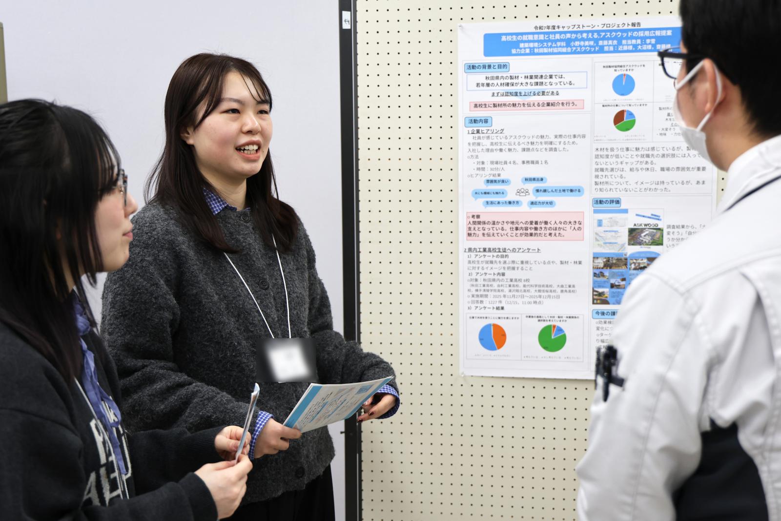 発表後には、ポスターを自由に閲覧できる時間が設けられ、協力団体の皆様と発表を終えた学生たちが、リラックスした雰囲気の中で終始和やかに意見交換を行う様子が見られました。協力団体からは、「社内では思いつかない、学生ならではの視点やアイディア、そして着地点に驚かされた」「学生と活動する中で非常に勉強になった。来年度以降も引き続き一緒に取り組みたい」「初の試みに不安もあったが、学生の優秀さに感銘を受け、秋田県立大学の学生の高い能力を実感した」などのコメントが寄せられました。