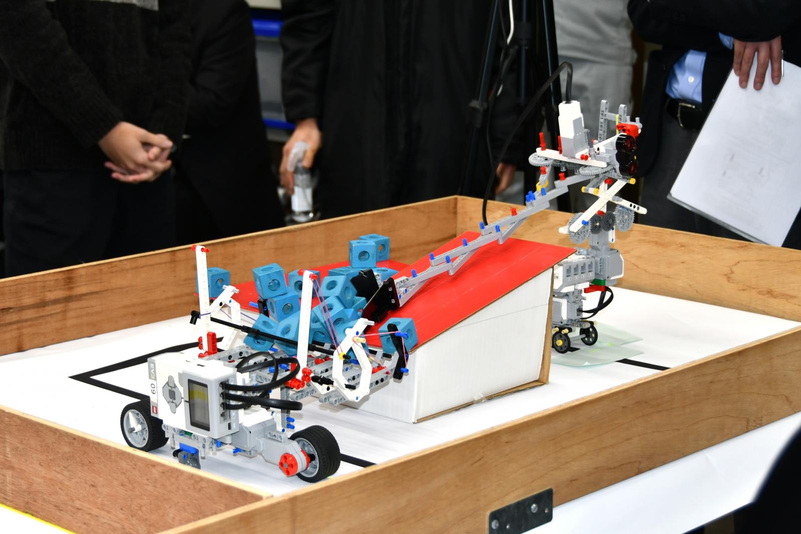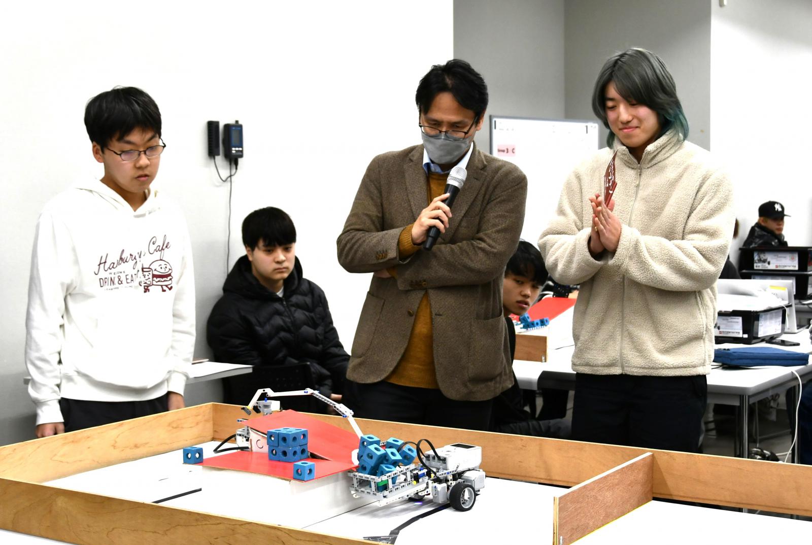 競技では、雪を模擬したブロックを建築模型の屋根から下ろし、雪捨てエリアへ運ぶことで得点を競います。各チームはロボットの性能を最大限に発揮させるだけでなく、得点を伸ばすための作戦にも工夫を凝らし、白熱した競技が繰り広げられました。