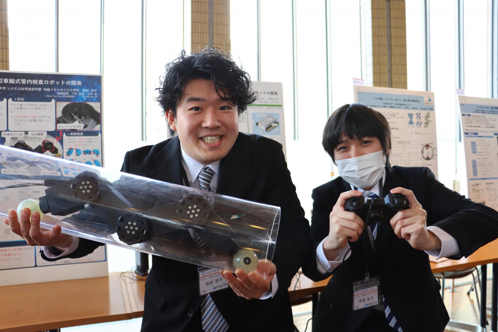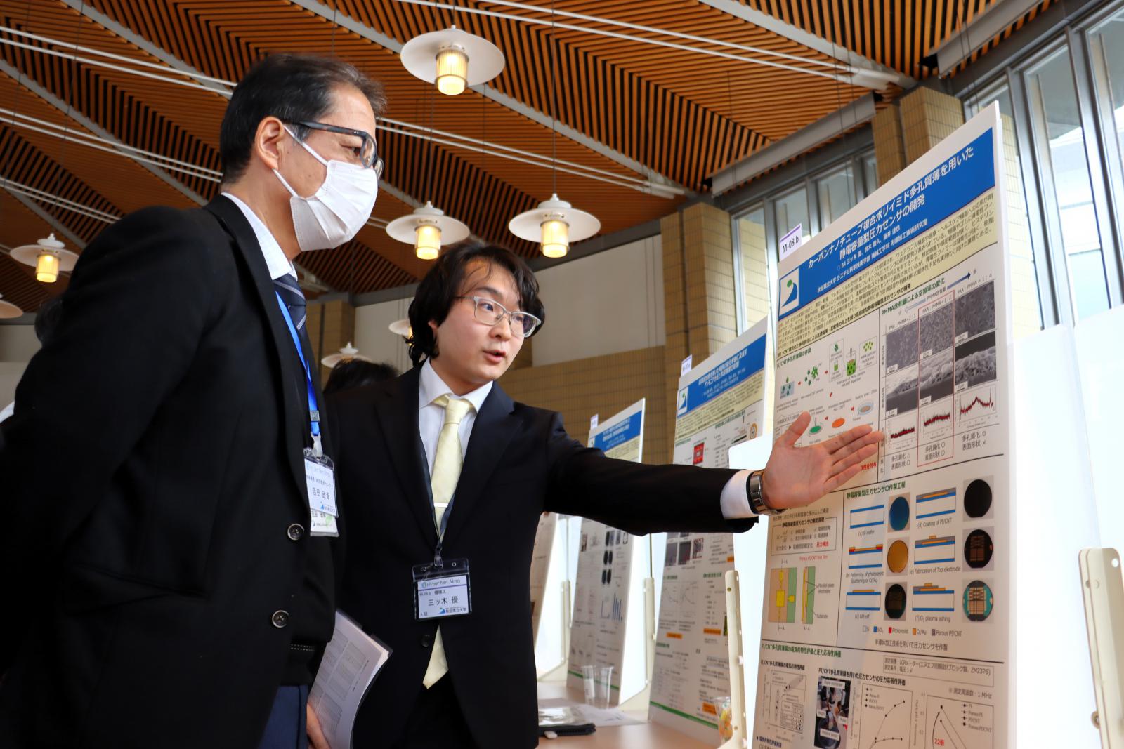 当日は、システム科学技術学部4年生、システム科学技術研究科の学生が、来場した企業技術者など学外の方に向け、卒業研究をはじめとする最新の研究成果をポスター形式でプレゼン発表しました。発表は2グループに分かれ、1時間ごとのコアタイムを設けて発表を行い、広範な業種分野の技術者の皆さんと活発にディスカッションしました。参加した学生からは、「自分の研究分野と異なる分野の企業の方からアドバイスをいただき、新たな気づきを得ることができた」「予想外の質問に戸惑うこともあったが、4年間で培った知識をもとに答えることができた」といった声が寄せられました。学生にとっては、自身の研究を社会にどう役立てるかという視点を再確認する機会となり、研究意欲の向上や新たな課題の発見にも繋がりました。