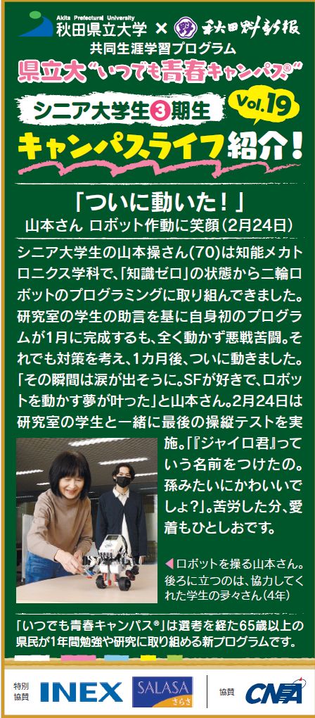 シニア大学生の山本操さん(70歳)は、「いつか自分の手でロボットを動かしたい」という長年の夢の実現に向け、知能メカトロニクス学科の齋藤 敬 教授[専門:医用生体工学]の指導のもと、二輪走行型ロボットの製作に挑んできました、2月24日、ついに大きな感動とともに結実しました。