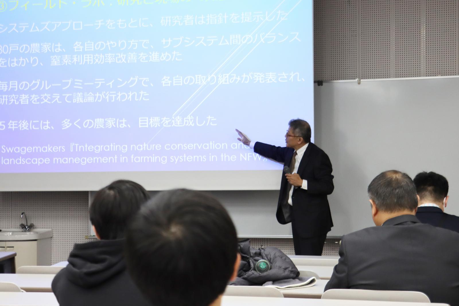 また、Post近代における農学研究の枠組みとして、農業者や農村に暮らす人々が自らの持続に向けて全体のバランスを意識している点に注目し、農業・農村の持続化に向けた「知の枠組み」の組み換えの必要性について言及。特に、現場にいる農業者の知と研究者による学術的知見を結び付ける場を構造化することの重要性について語りました。