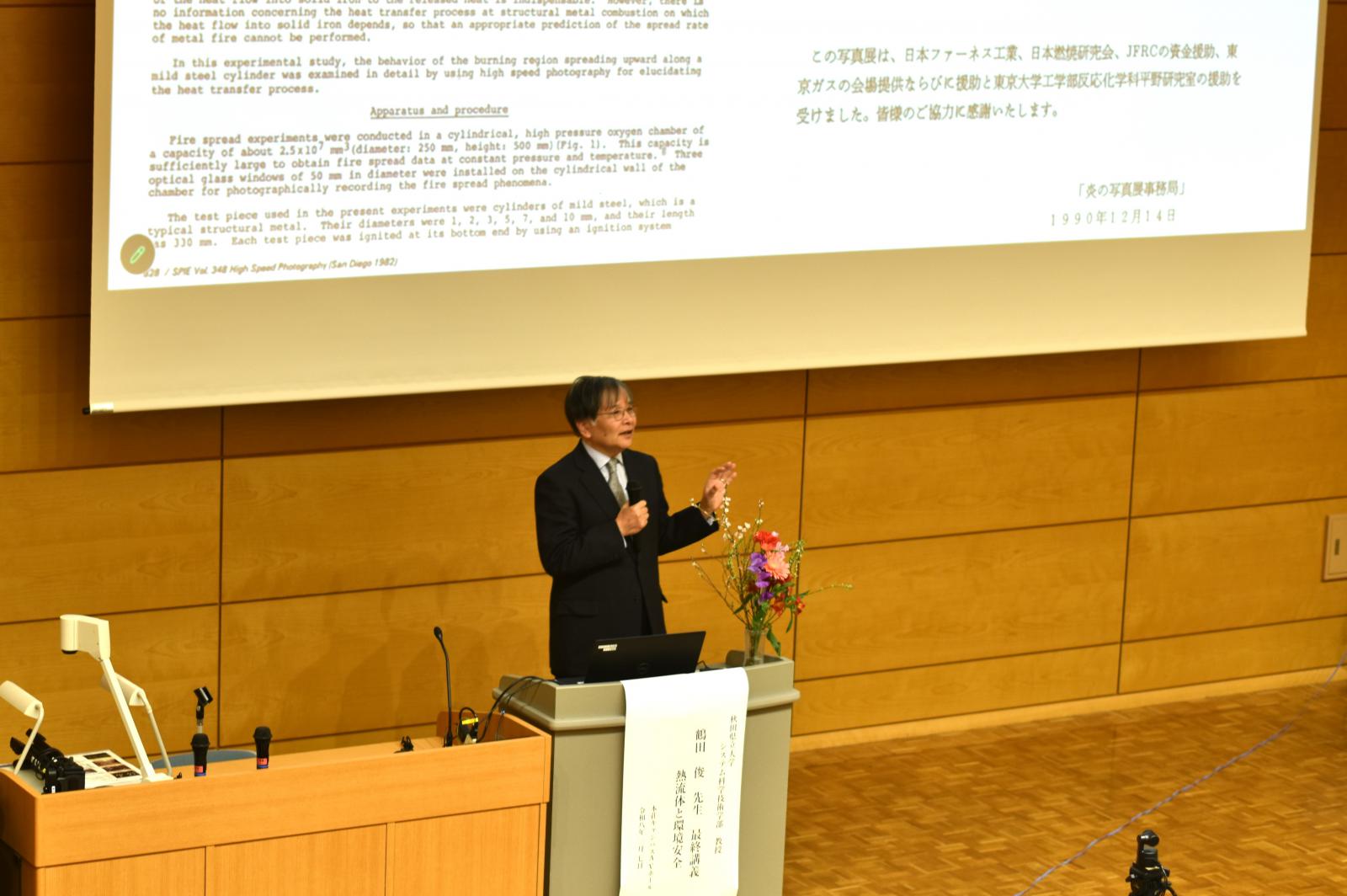 「熱流体と環境安全」をテーマとした講義では、これまでの研究や実務経験に基づく幅広い取り組みについてご紹介いただきました。カリフォルニア大学での研究や環境安全に関する業務、さらには火災や事故の現場に赴いての調査など、現場に根ざした研究を重ねてこられた歩みが語られました。